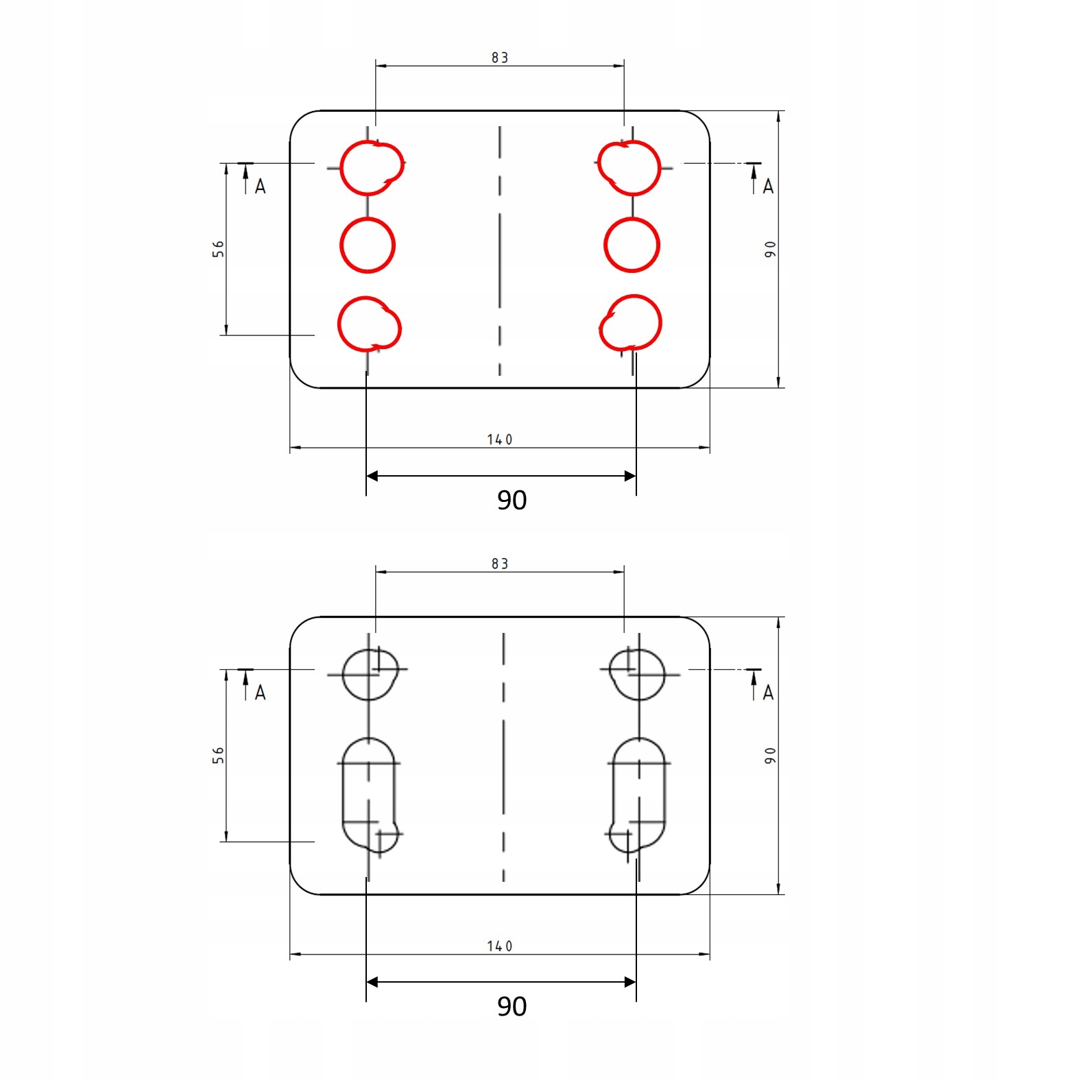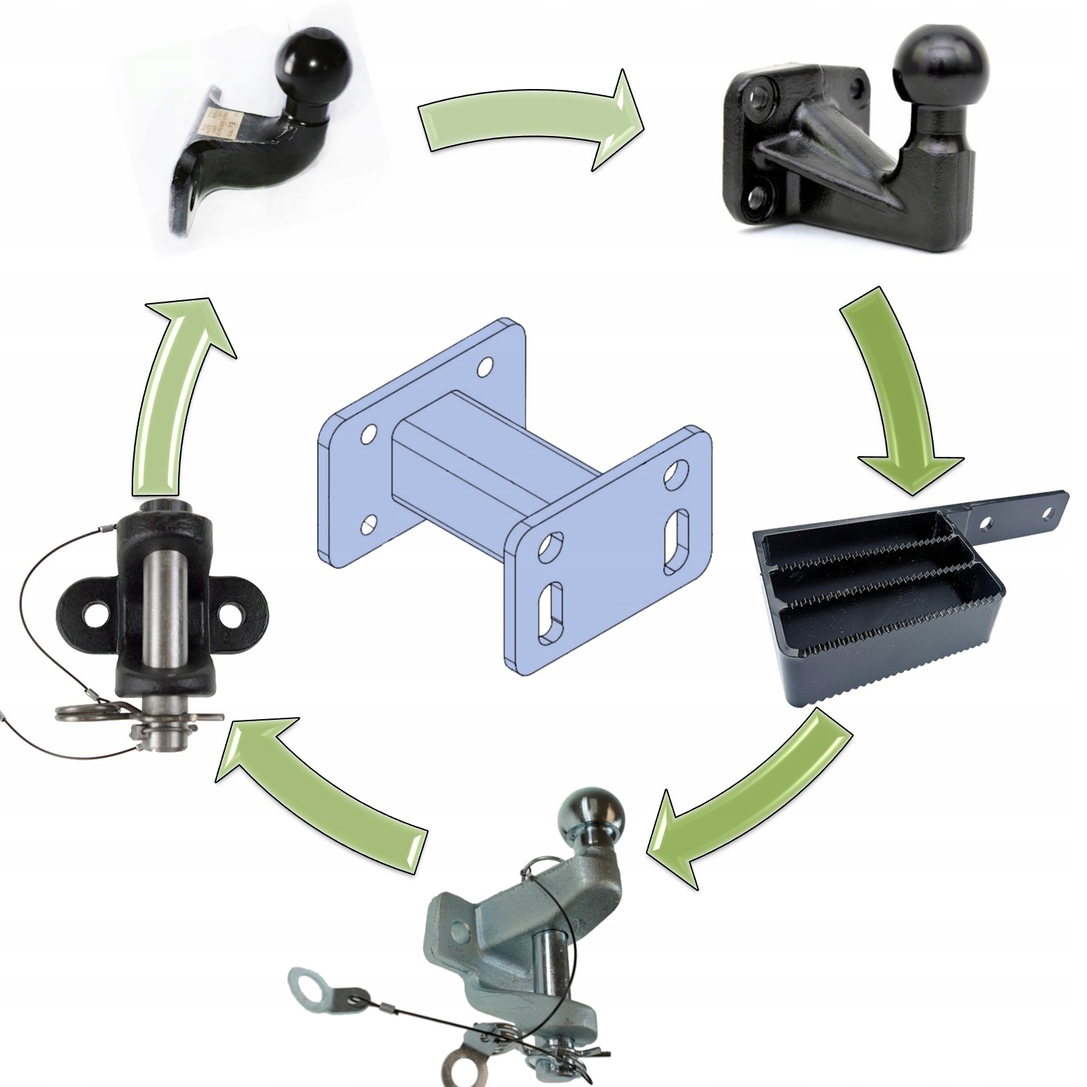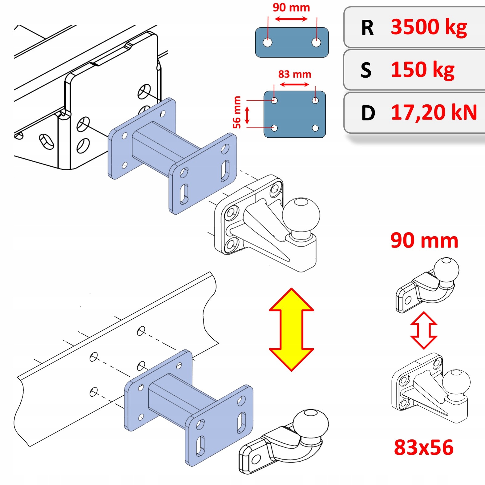 Это расстояние позволяет установить шар с расстоянием отверстий 90 мм, а также шар, закрепленный с помощью 4 винтов с расстоянием 83x56 мм >. В то же время, благодаря специально подготовленным отверстиям, это расстояние может выполнять роль переходника для различных типов фланцевых шаров (опущенных, удлиненных, регулируется по высоте)., принадлежности для буксировки (ступени для буксировочного крюка) или транспортные сцепки (захватные устройства, проушины).