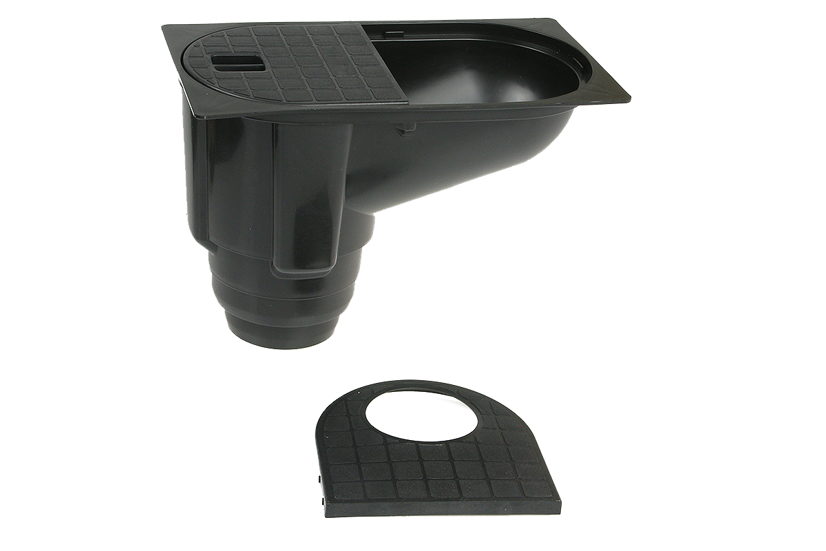 Тело желобного люка имеет вертикальный выпуск для канализационных трубдиаметром 110 мм.