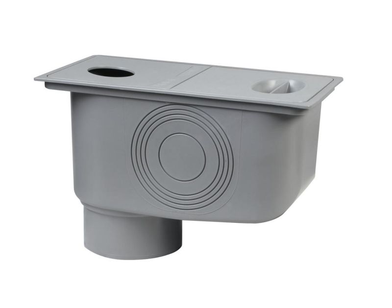 Тело желобного колодца имеет вертикальный выход для канализационных труб диаметром 110 мм. На боковых стенках корпуса имеются дополнительные тиснения для канализационных труб диаметром 50; Ø 80; Ø 90; Ø 100; Ø 110 мм, который при необходимости можно вырезать и подключить к боковому сливу.