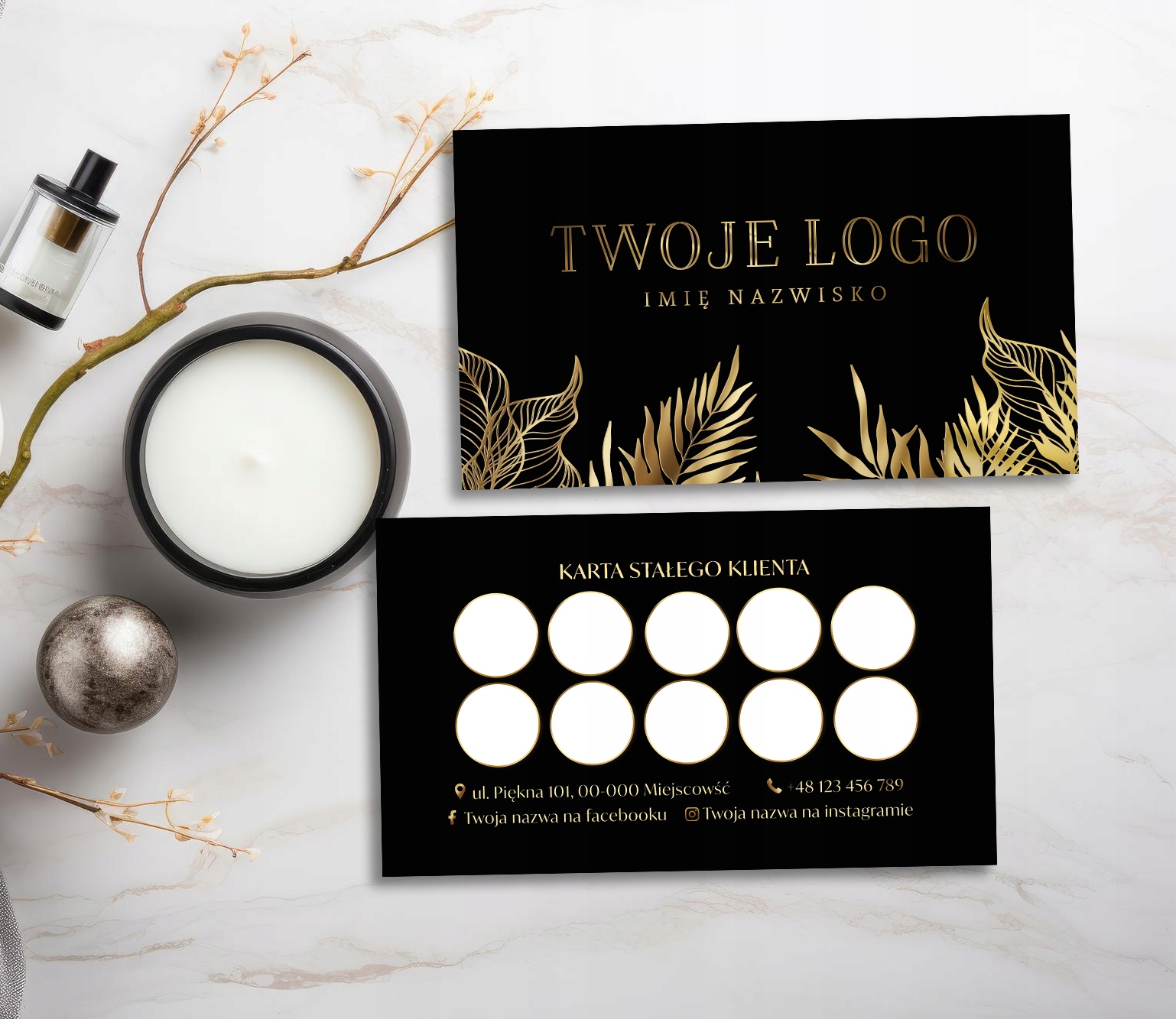 Customer Card с пространством для скидки, которая также является демонстрацией компании. Красивый дизайн с золотыми листьями
