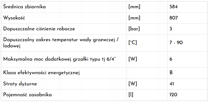 Диаметр резервуара [мм] 584 Высота [мм] 807 допустимого рабочего давления [Бар] 3 Допустимый диапазон температуры нагрева/ледяной воды [° C] 7 - 90 Максимальная мощность дополнительного типа нагревателя TJ 6/4 "[W] 6 Класс энергоэффективности B Потеря DIST [в] 41 емкость [L] 120