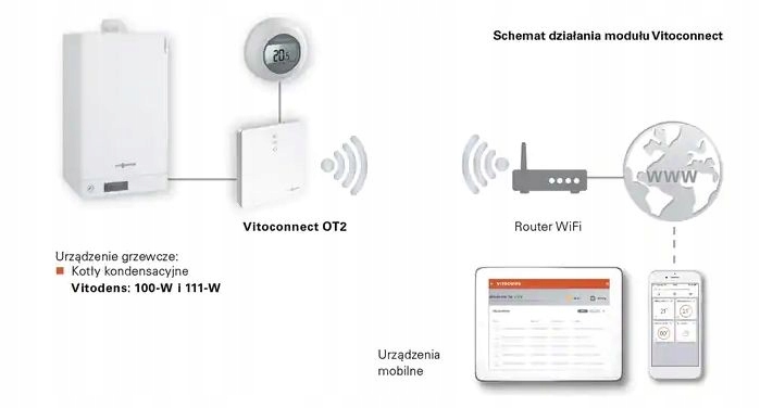 Vitoconnect OT2 + Vitotrol 100 OT1 Производитель Viessmann. Модуль связи VitoConnect OT2 - это разъем между котлом и применением для обслуживания системы отопления и для дистанционного обслуживания через витуид. Он подключен непосредственно к регулятору котла с кабелем. Благодаря этой новой технологии мы можем управлять котлом через мобильные устройства, поэтому управление центральной установкой отопления. Это становится намного проще.