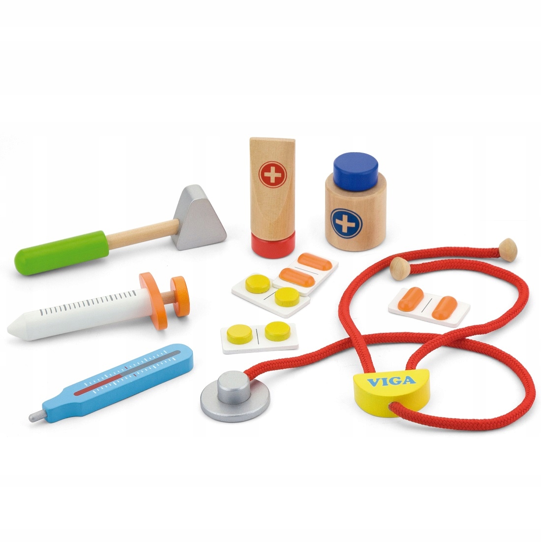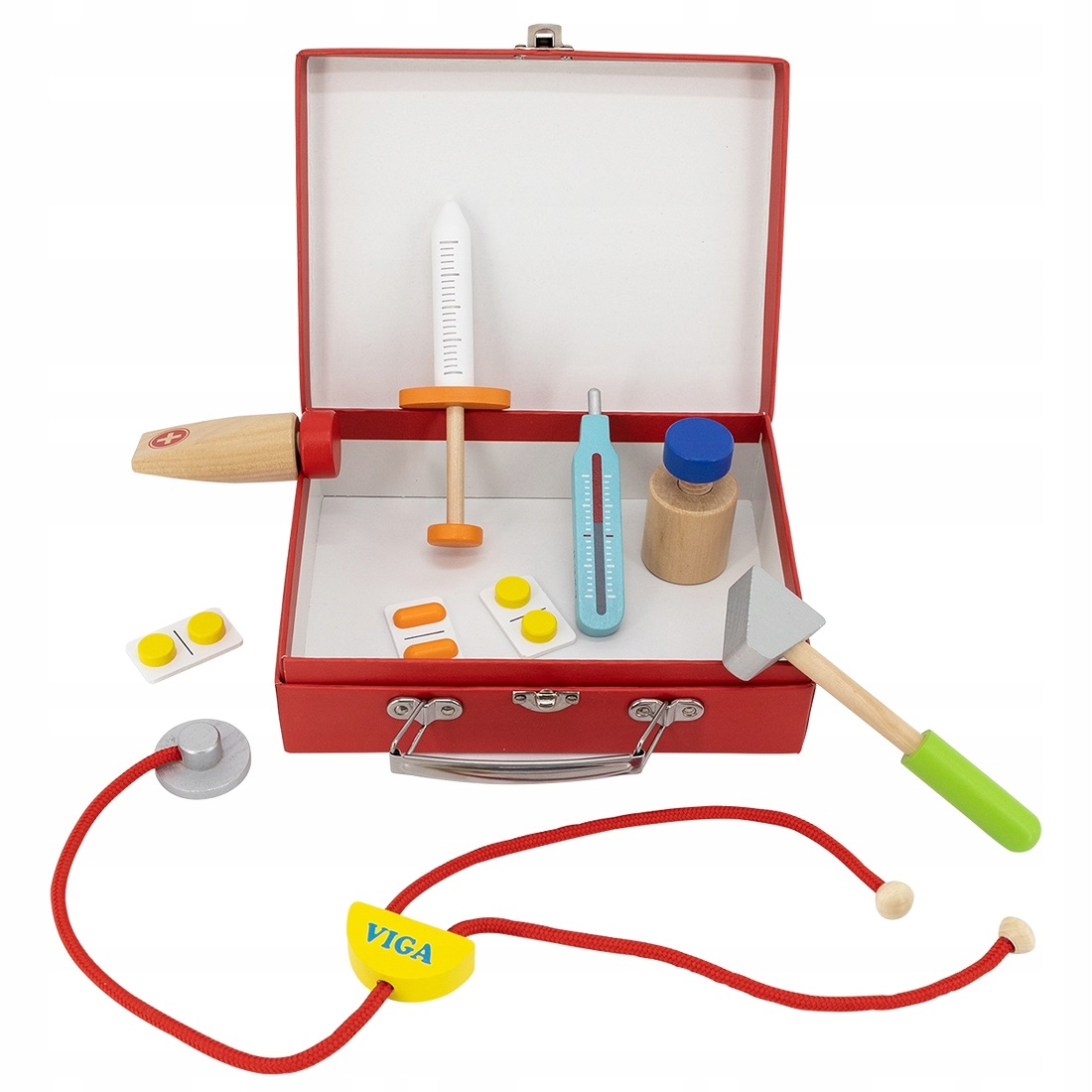 Пришло время начать играть в фантастического доктора. В деревянном чемоданчике малыш найдет все необходимые для работы настоящего врача принадлежности: стетоскоп, шприц, термометр, молоток, таблетки, мазь, сироп... Ребенок сможет придумывать сценки, стимулируя свое воображение. и творчеству, а также помогать больным мишкам и куклам, формируя тем самым эмоциональный интеллект, чувствительность и эмпатию. Кроме того, каждый ребенок поймет, что ему не нужно бояться врача, а шприцы, а иногда и невкусные сиропы вводятся для его же блага.
