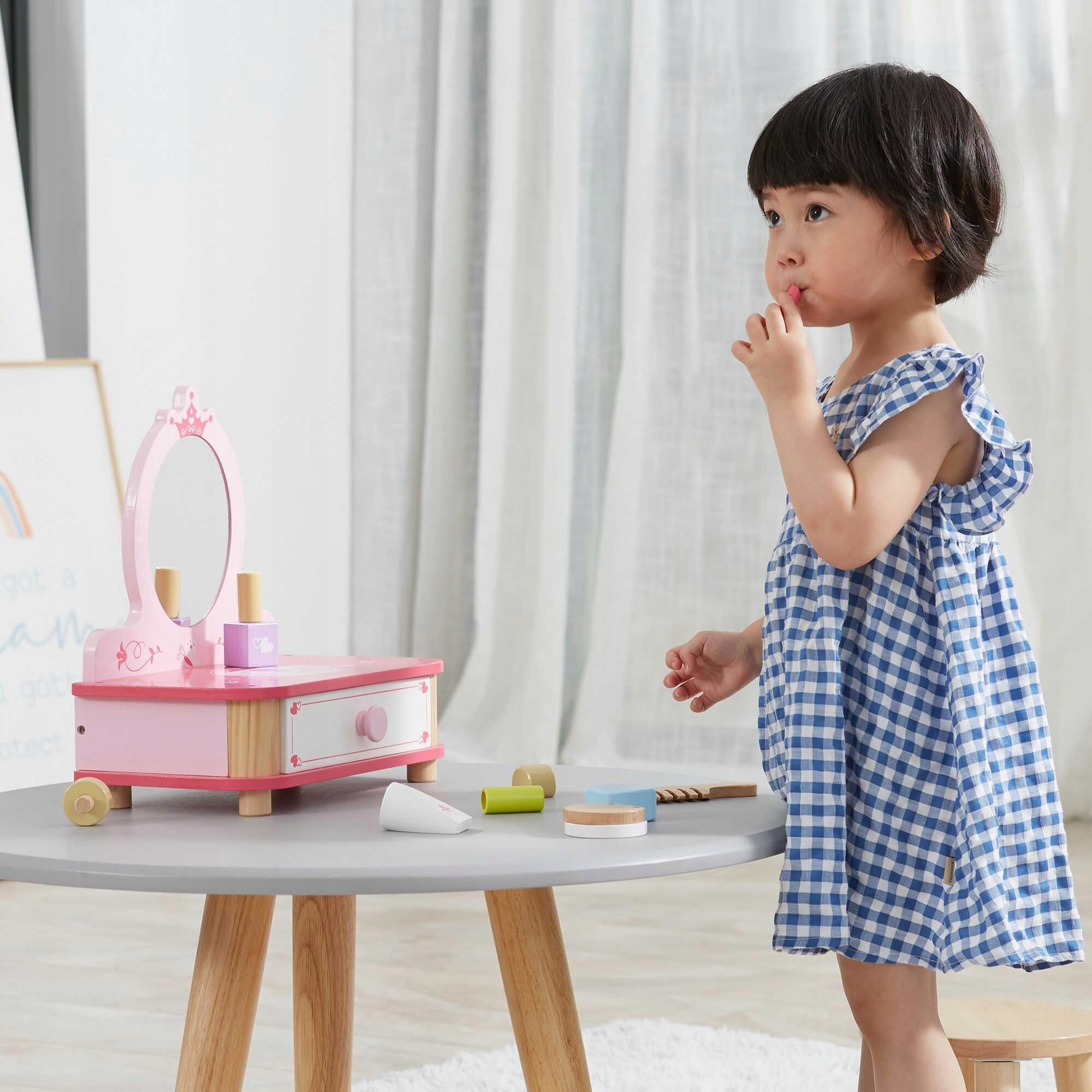Красивый розовый туалетный столик от Viga > это предмет мебели, о котором мечтает каждая девушка. В туалетном столике есть выдвижной ящик, в котором маленькая принцесса сможет спрятать свои сокровища. В комплект также входит множество аксессуаров. Все сделано из дерева и окрашено нетоксичными красками, безопасными для детей и окружающей среды.
