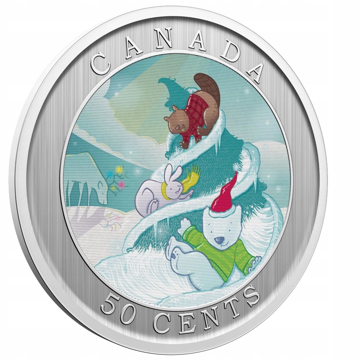 На реверсе изображено двояковыпуклое изображение веселых канадских животных, в том числе белого медведя Черчилля, скатывающихся с горки, причем изображение меняется по мере движения монеты, создавая иллюзию движения. На этой стороне также имеется надпись «CANADA» и номинал «50 CENTS».