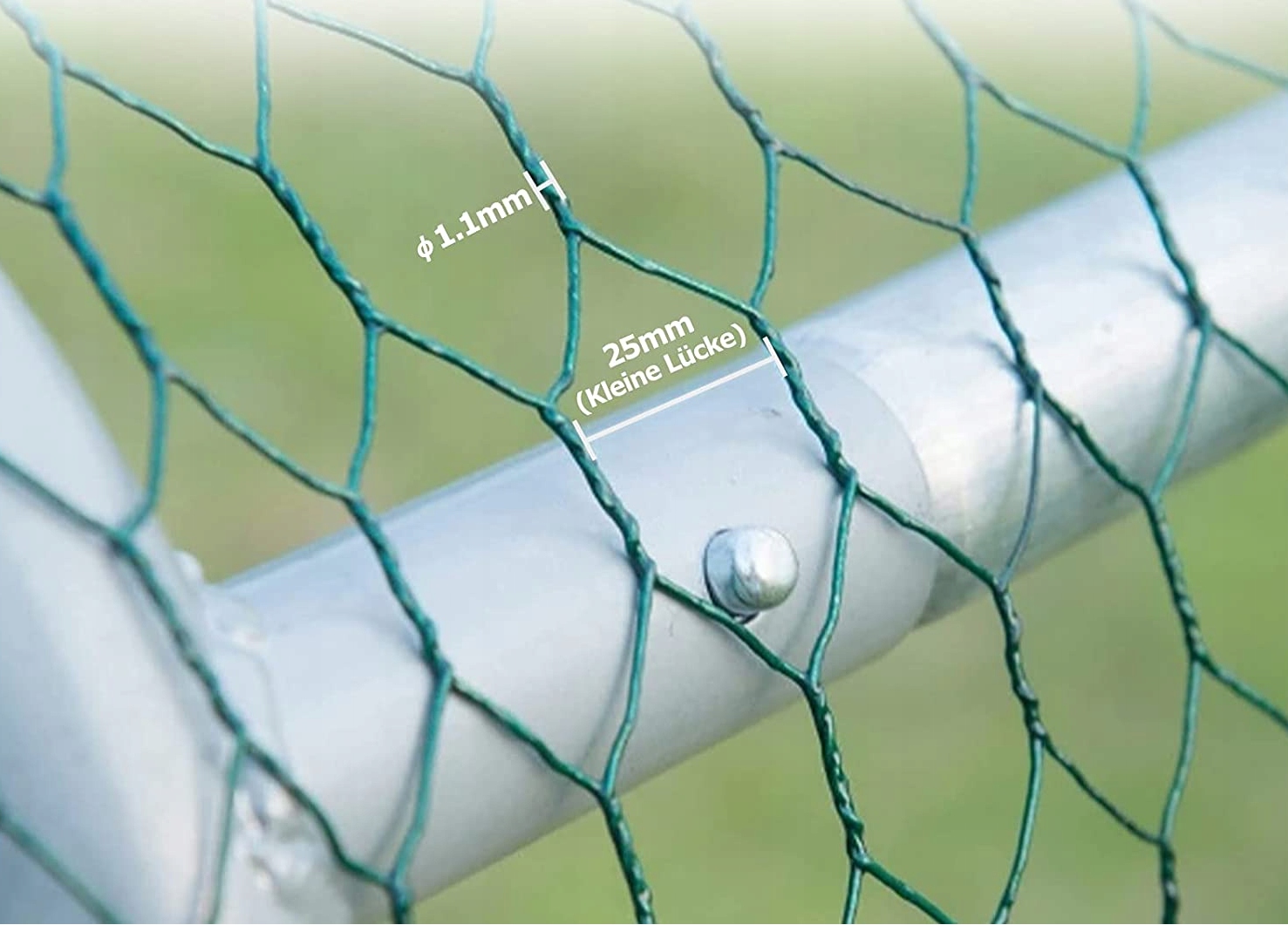 Диаметр шестиугольной сетки 25 мм, диаметр проволоки сетки для кур 1,1 мм. Сетка меньшего размера защищает птицу от хищников и в то же время обеспечивает циркуляцию воздуха.