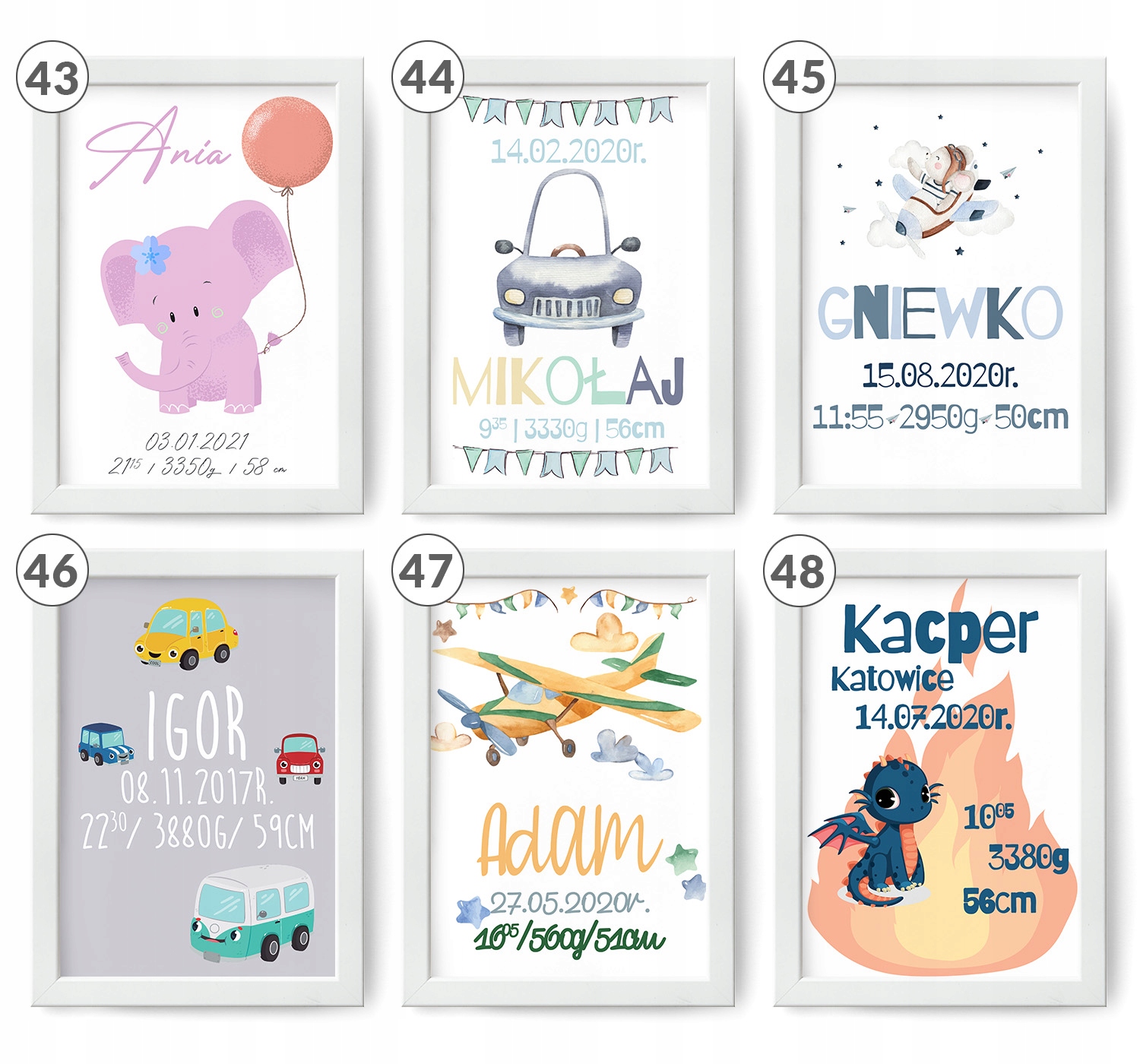 - все информация, указанная в свидетельстве (имя ребенка, вес, рост, дата рождения, время рождения, иногда: место рождения, имена родителей)