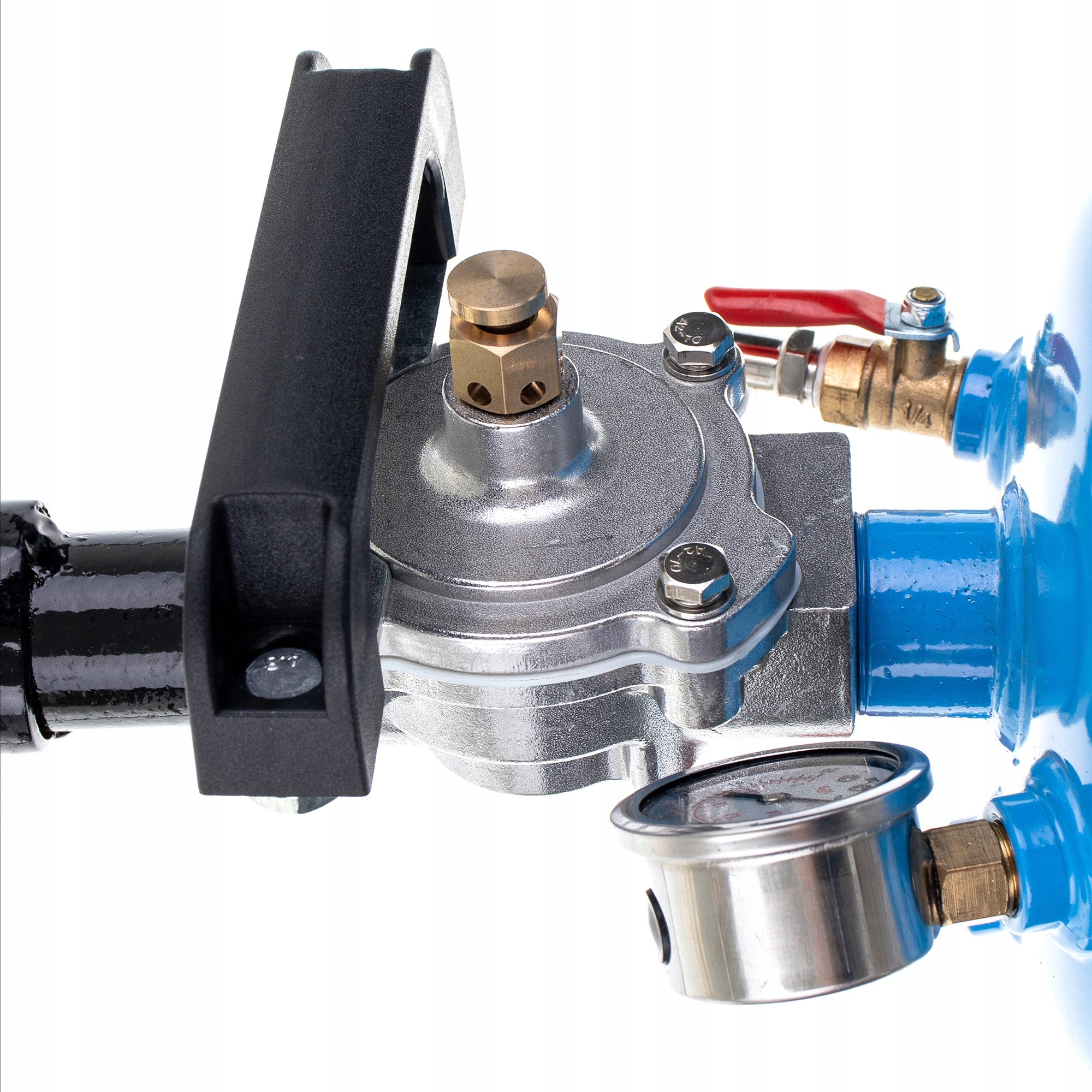 Важным элементом устройства является предохранительный клапан, управляющий давлением в баке. Прозрачный датчик давления будет указывать на токовое давление накачанного воздуха.
