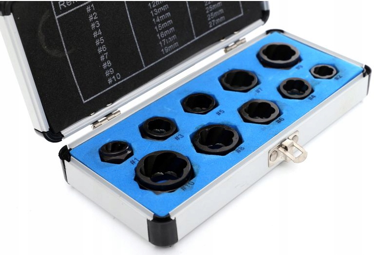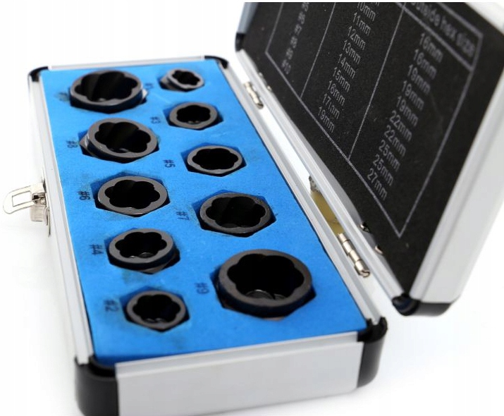 В комплект входят экстракторы 10 размеров: 9, 10, 11, 12, 13, 14, 15, 16, 17 и 19 мм.