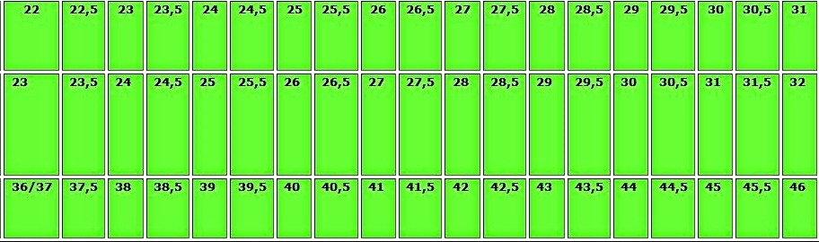 Метрическая нумерация, размеры, доступные на аукционах от 22 до 31, целые и получисла, предлагаемые на других аукционах.