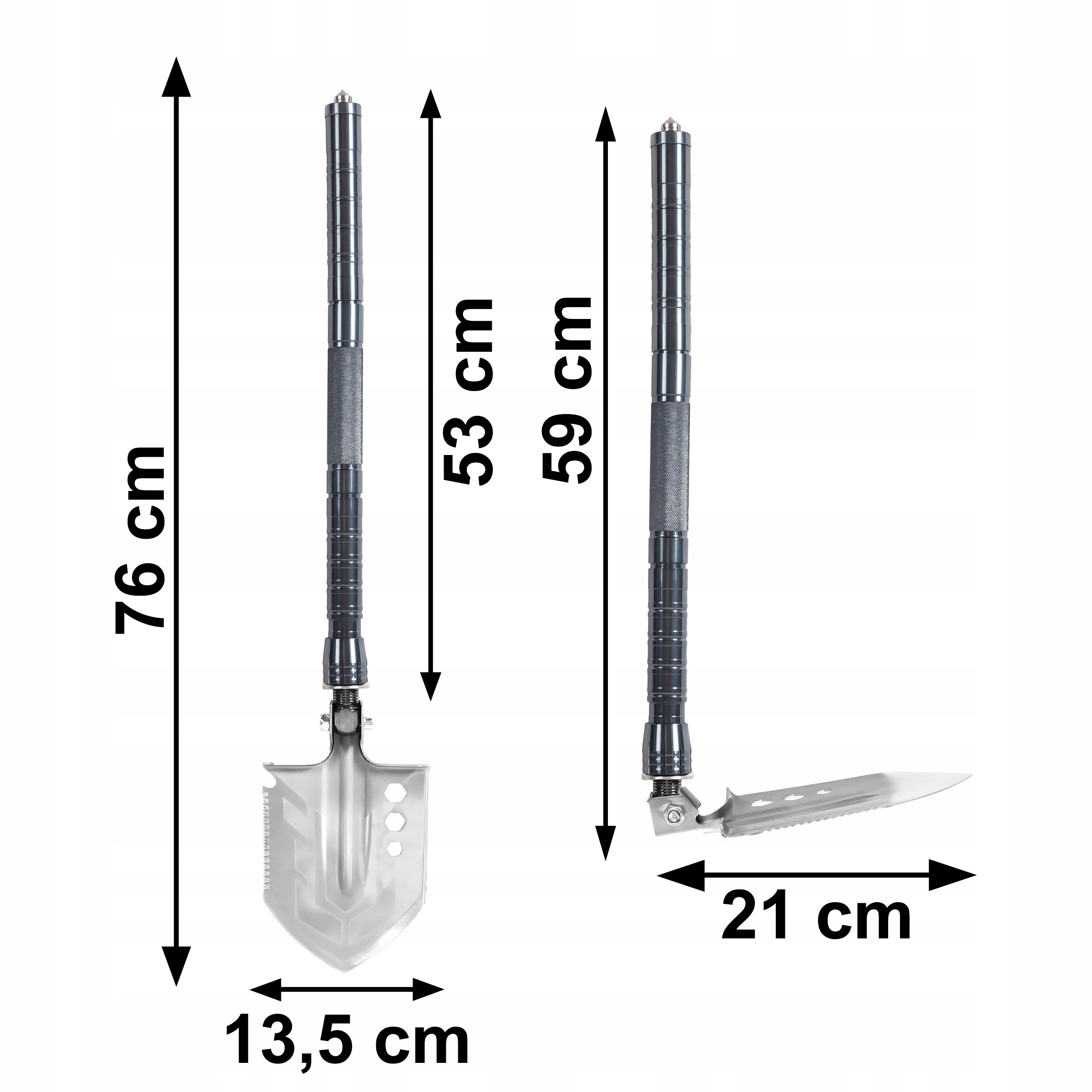 Заточенные конические сверла изготовлены из высококачественной быстрорежущей стали HSS и покрыты титановым покрытием. Прекрасно оснащенная универсальная лопата – отличный инструмент на любой случай. Его точный дизайн и солидное качество изготовления гарантируют надежность и исключительную долговечность. Это будет идеальный набор инструментов во время лагеря, выживания и любой другой экспедиции. Он занимает мало места и имеет бесчисленное множество приложений. Лопата также отлично подойдет для домашней мастерской, автомобиля или сада. Удобная ручка состоит из трех элементов длиной примерно 17 см каждый. Рукоять изготовлена из прочного и стойкого алюминиевого сплава, поэтому ее можно использовать как дубинку для самообороны. Военная лопата была оснащена небольшим многофункциональным ножом.