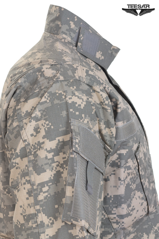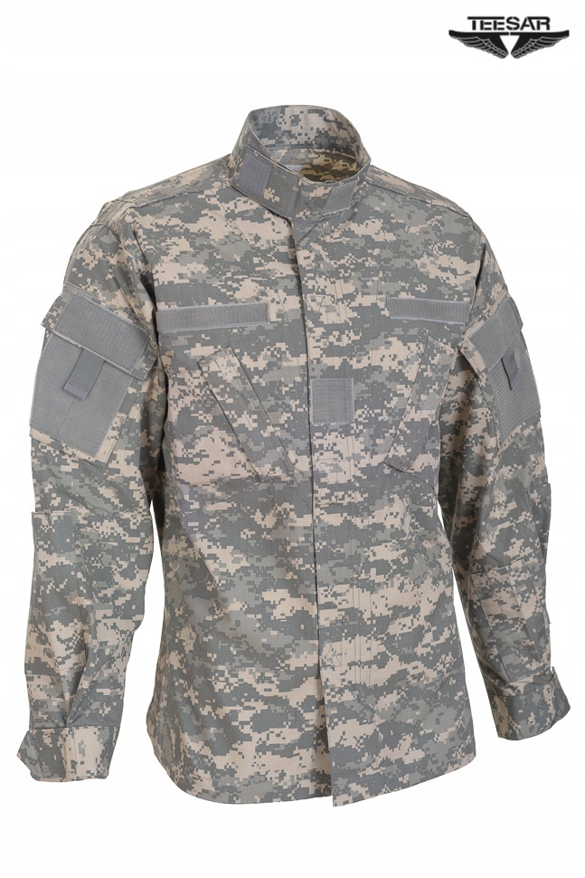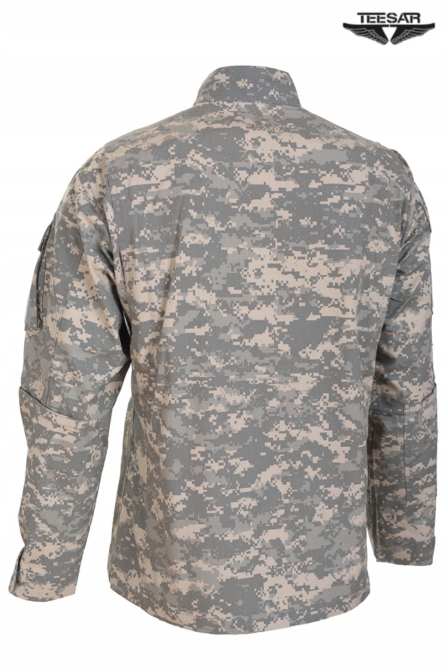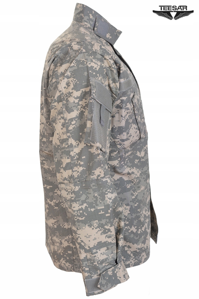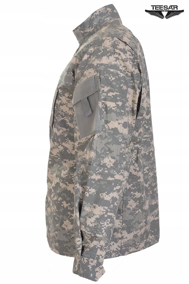 Выкройка униформы армии США — ACU (Army Combat Uniform). Производится американской компанией Teesar, INC – Картесвилл, Джорджия. Изготовлен из материала NyCo — 50 % хлопок/50 % нейлон, усиленный дополнительной сеткой Rip-Stop. Толстовка отличается современным кроем и повышенным комфортом при ношении. Семь карманов, в том числе четыре характерных наклонных (два на рукавах и два на груди), закрывающихся на липучку. Специальные карманы для мягких налокотников. Усиления в критических точках. Застежки-липучки для знаков различия на рукавах и груди. Застегивается все на двустороннюю молнию YKK, которую можно расстегнуть снизу. Усилены в локтях вторым слоем материала. Манжеты с регулировкой по окружности. Возможность застегивания воротника для защиты шеи.