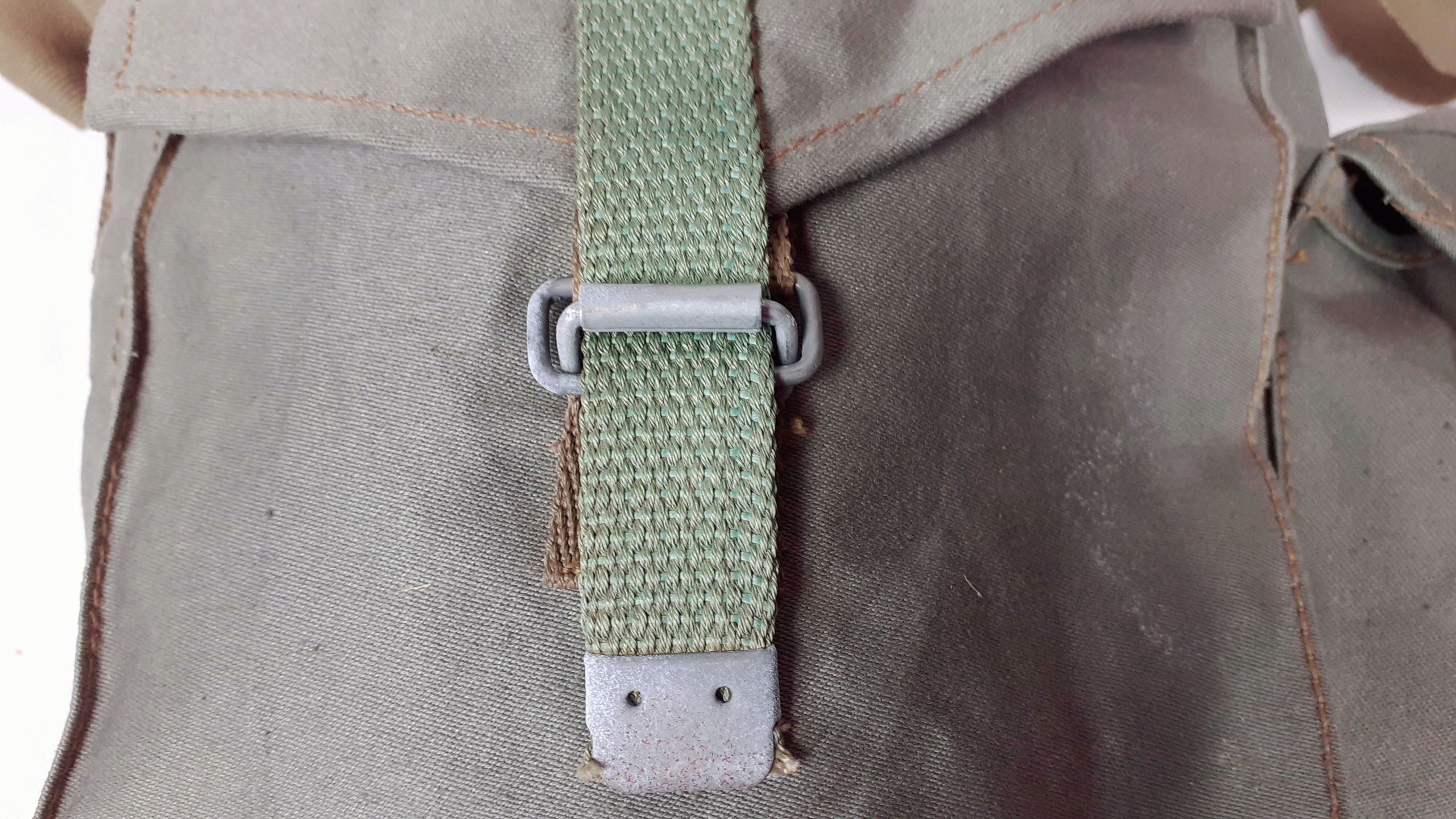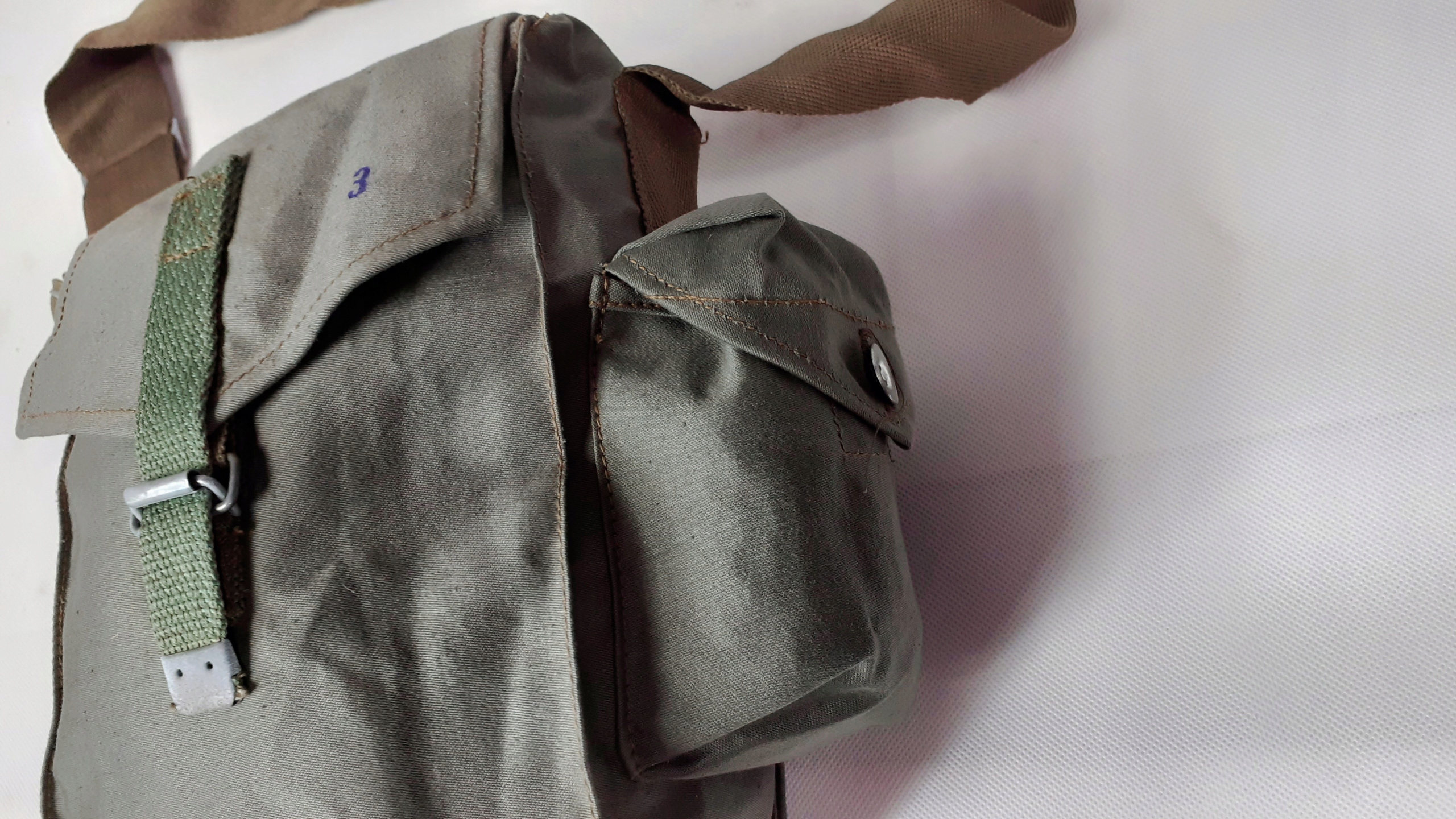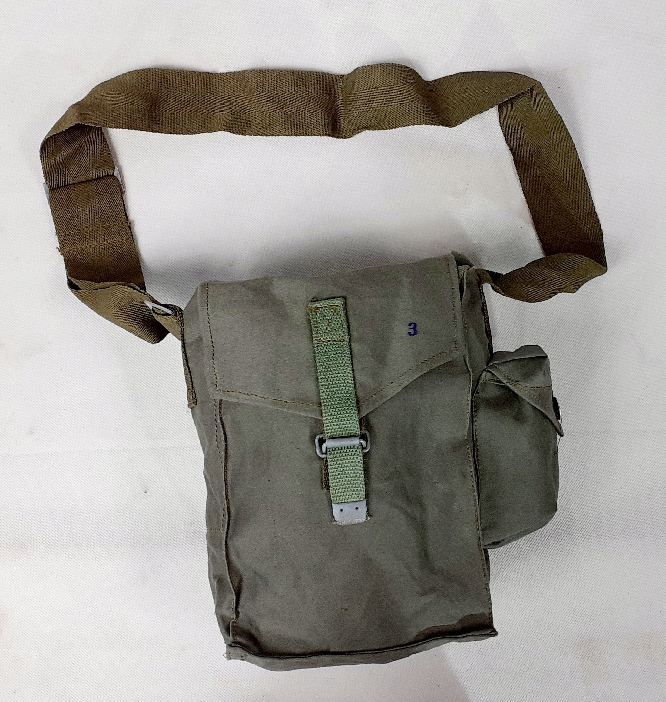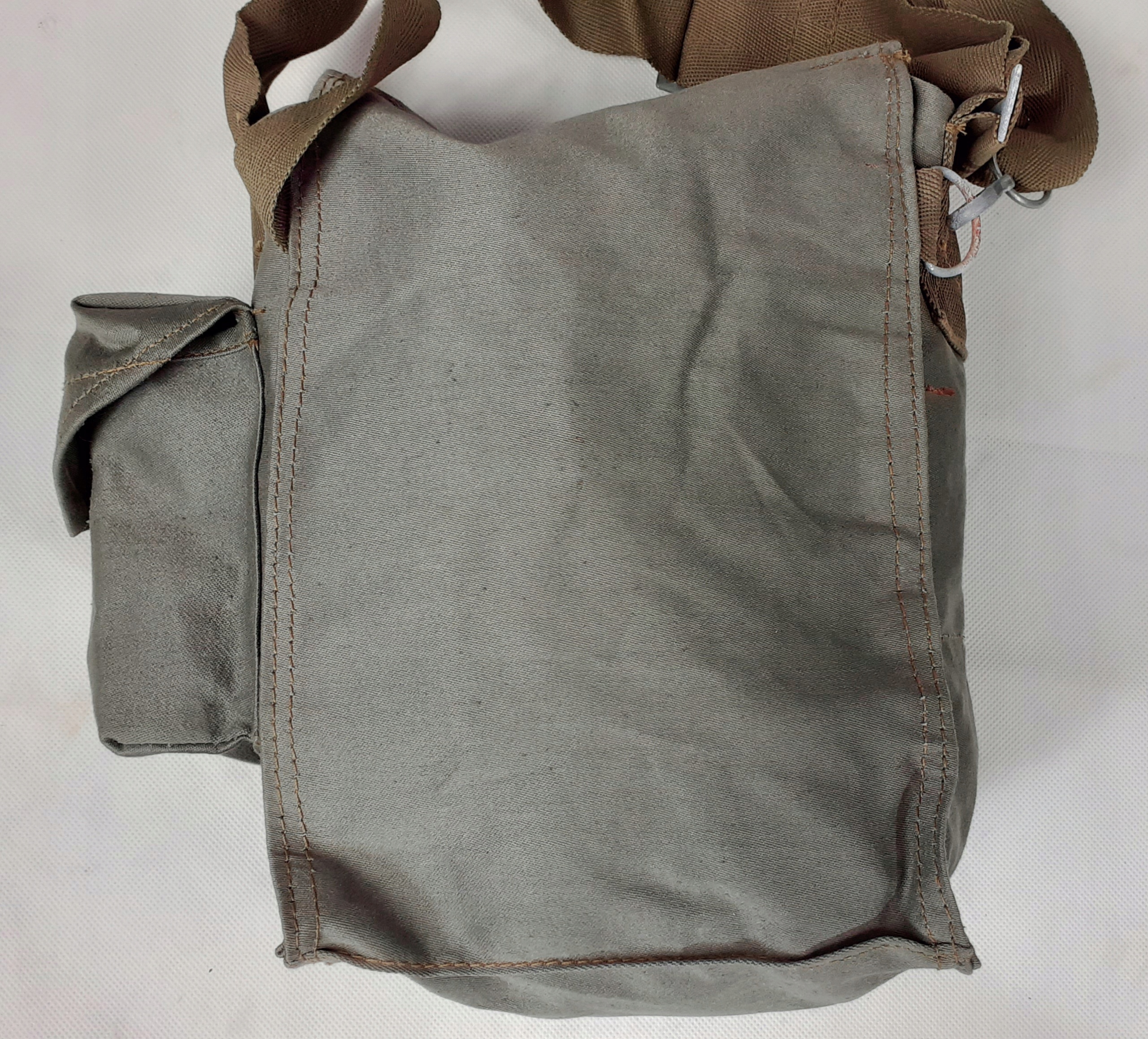 Сумка поставляется с военных складов, в ней может быть минимальное загрязнение или признаки коррозии на металлических деталях. Он оснащен прочным регулируемым лямкой через плечо и открывается через клапан со складным ремнем. Сумка имеет просторное внутреннее отделение и дополнительный внешний карман. Изготовлен из прочного, пропитанного материала - водонепроницаемого.