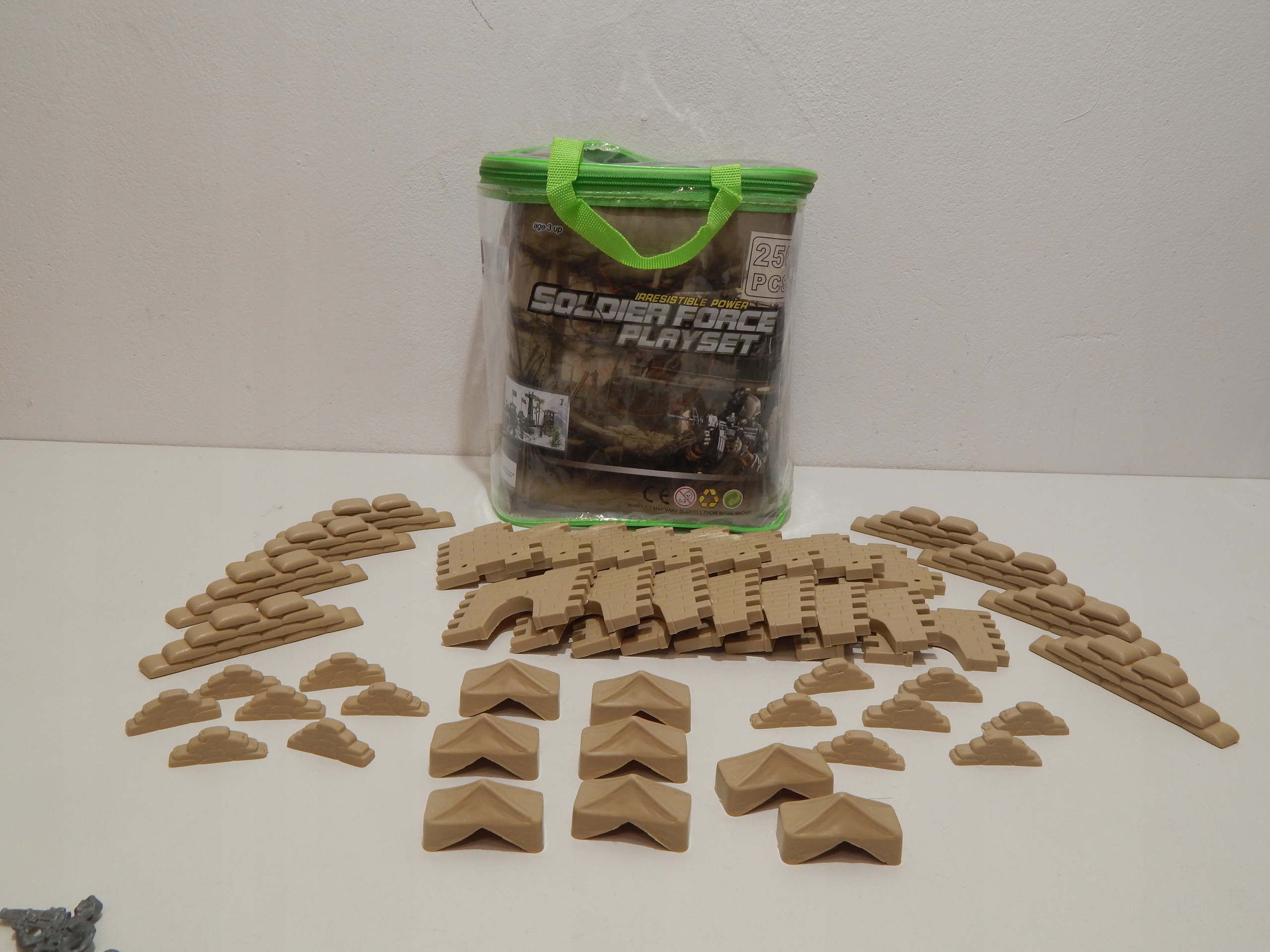 - 250 армейских деталей и аксессуаров, включая танки, грузовики, вертолеты, ограждения, солдат и другое боевое оборудование.< /li>