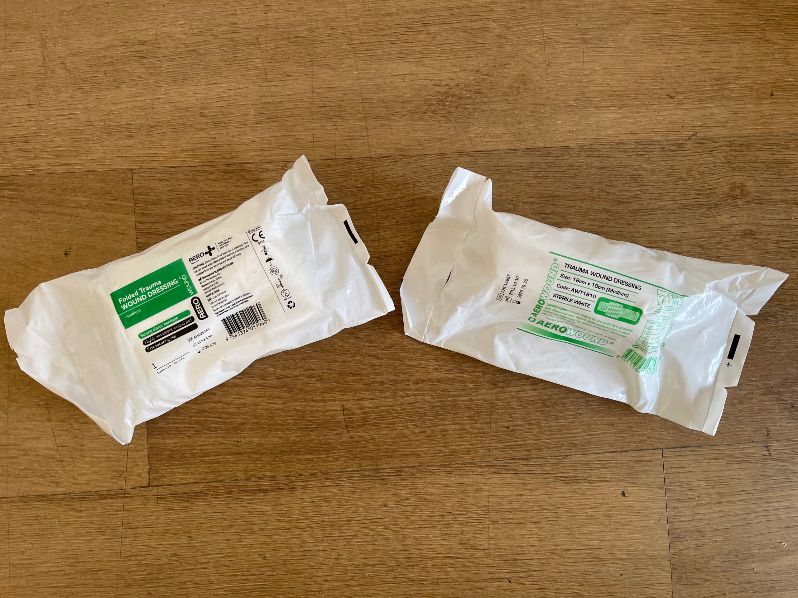 Изделие, видимое на фотографии, представляет собой сложенную травматическую повязку AeroWound, то есть комплексную травматическую повязку (комбинированную повязку).