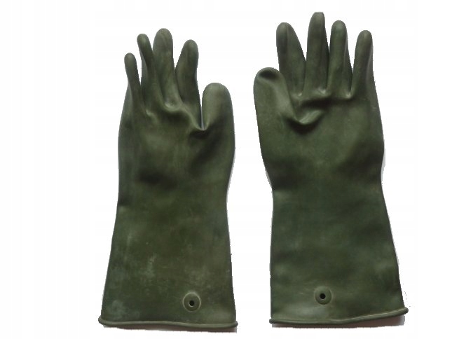 Перчатки из толстой резины, предназначенные для тяжелых работ, устойчивые к воздействию воды и химикатов – военного происхождения.