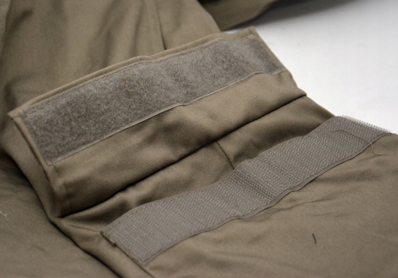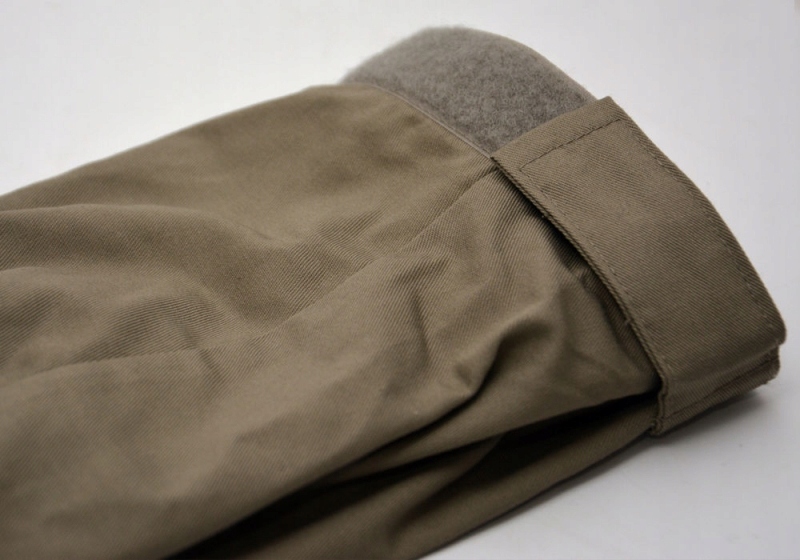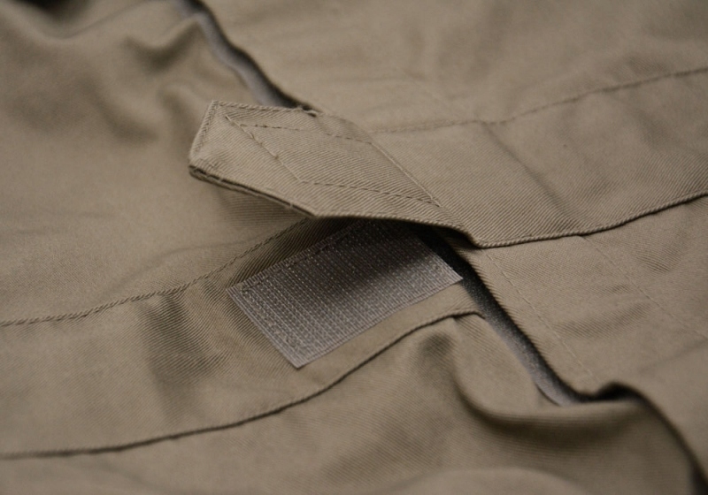 Цельный серый костюм застегивается спереди на прочную липучку. У него есть много мест, где мы можем настроить его схемы. Регулировка с помощью манжет на липучках происходит внизу рукавов и штанин, сзади на уровне талии. Комбинезон имеет один наклонный карман на левой стороне груди. Плечевые лямки также застегиваются на липучки.