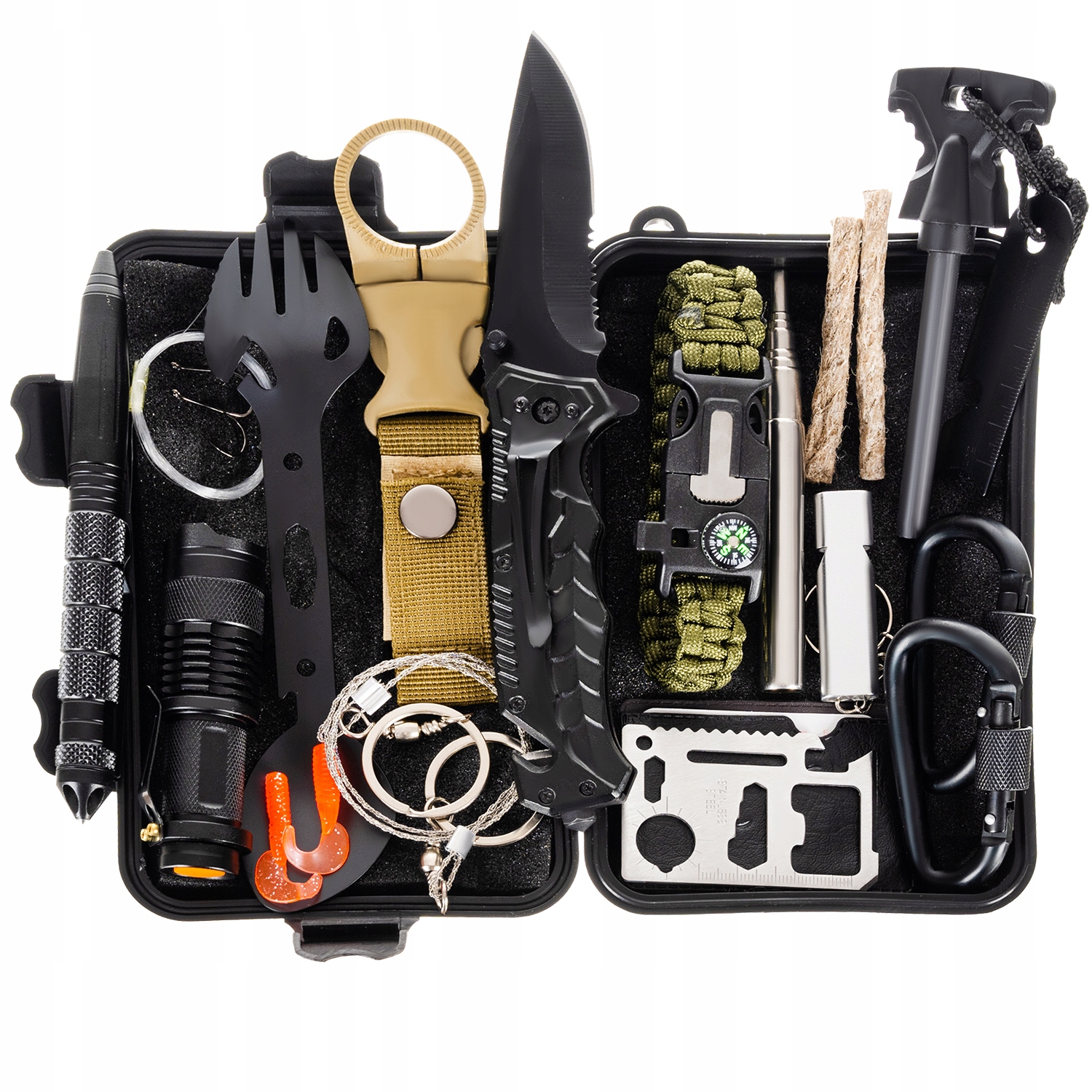 - 32w1 - В комплект входит: струнная пила длиной примерно 60 см, складной нож с пилой и резаком, тактическая ручка, карта выживания 11-в-1, зажигалка с магниевым стержнем и поддоном для измельчения со шкалой в см и открывалкой для бутылок, фонарик - питание от батарейки АА (батарейки в комплект не входят), термоодеяло130x210 см, закрытый контейнер для хранения, держатель бутылки на пояс, паракордовая лента - около 350 см паракорда с компасом, свистком и зажигалкой - все в виде ленты, силиконовая приманка 2 шт + леска + 2 крючка, предметы первой необходимости - ложка с вилкой и открывашка + нож, складной коптильня, шпагат для растопки 2 шт, карабин b>2 шт.Это очень большой набор, позволяющий выжить в очень сложных условиях.