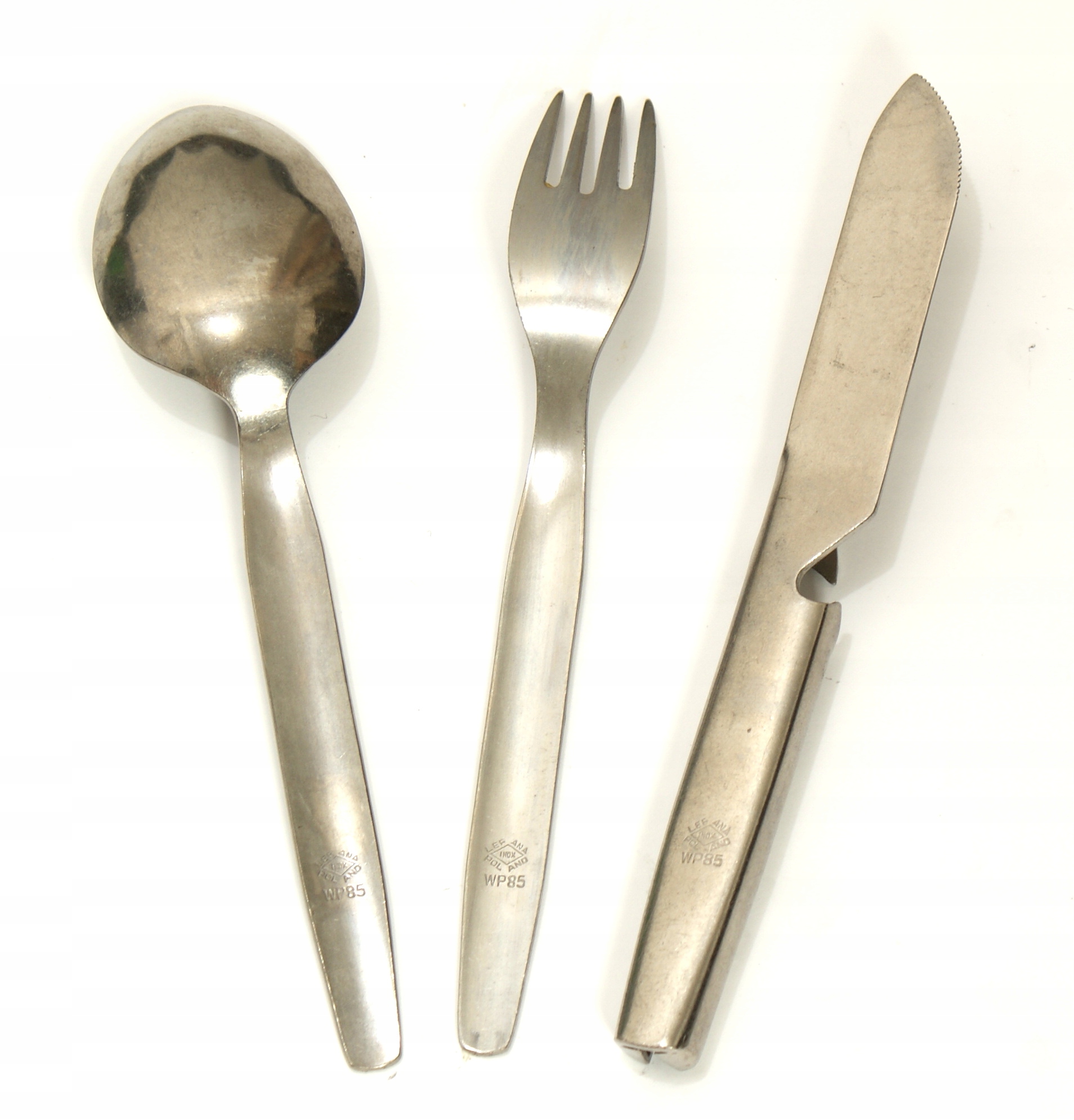 - Классический, простой в сборке набор, состоящий из ложки, вилки и ножа. Держатель ножа включает в себя встроенную бутылку и консервный нож. Рукоятку ножа можно использовать и как ручку для польской военной столовой.