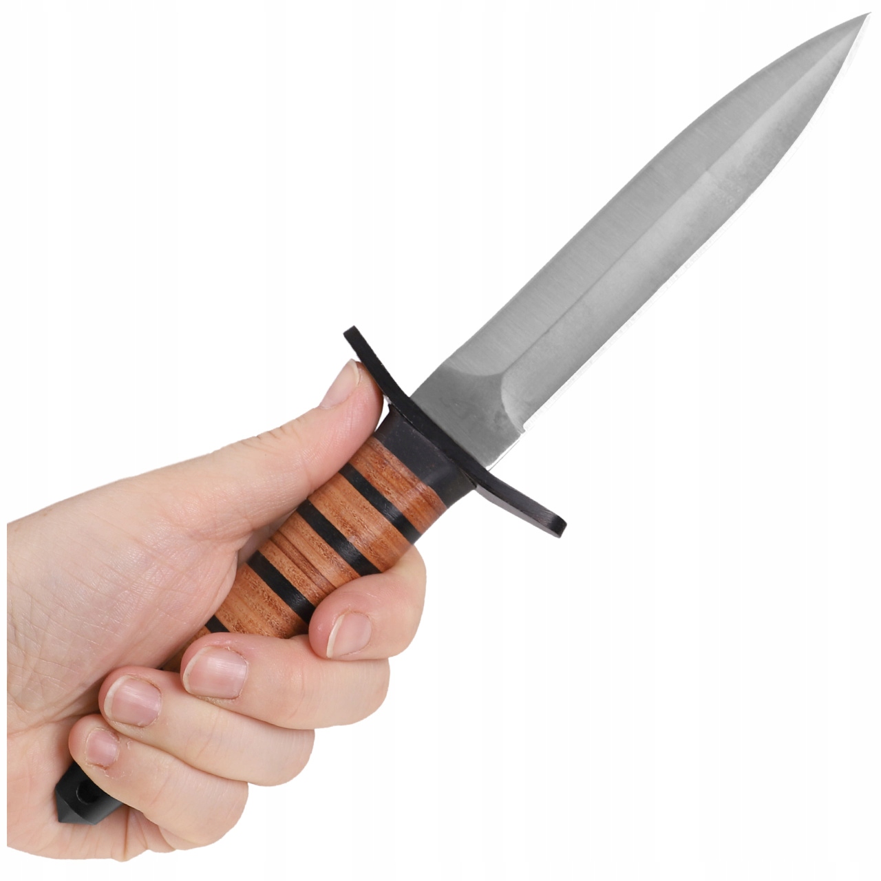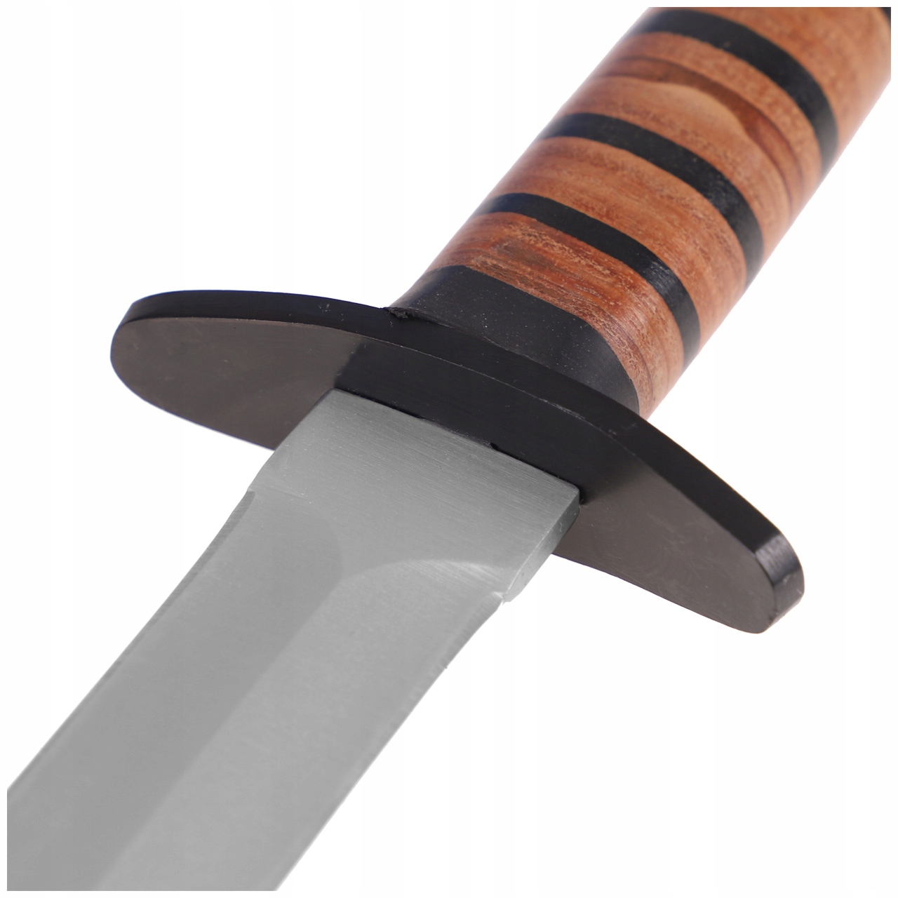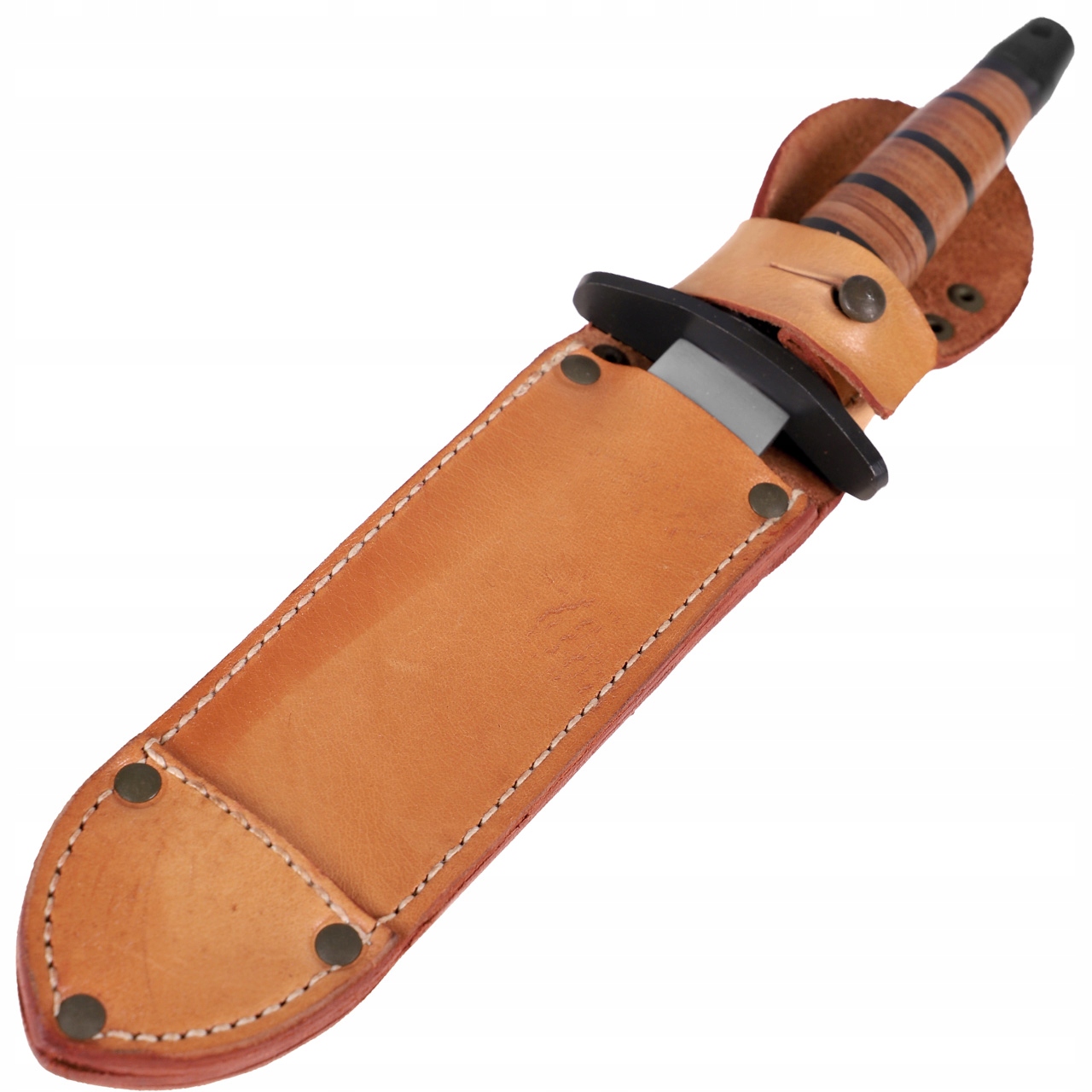 Качественная нержавеющая сталь и классическая кожаная ручка дает долговечность ножа и оригинальный военный характер.