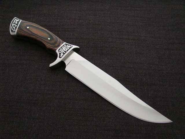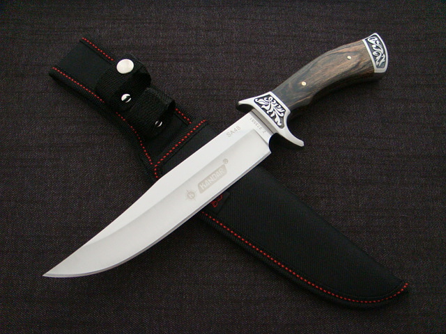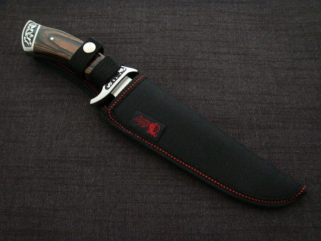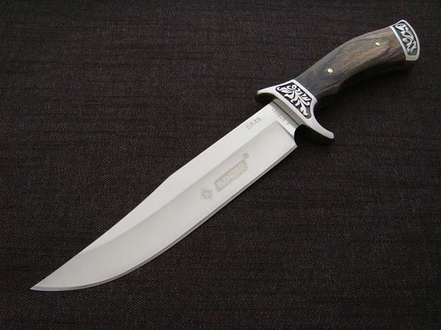 Нож имеет цельнотянутую конструкцию из стали 420. Эргономичная рукоятка из металла и дерева. Он идеально профилирован, что обеспечивает отличное сцепление. В комплект входит чехол с креплением на ремень. Нож новый и острый. Подписано, в зависимости от поставки, надписью Columbia, Kandar или BSH.