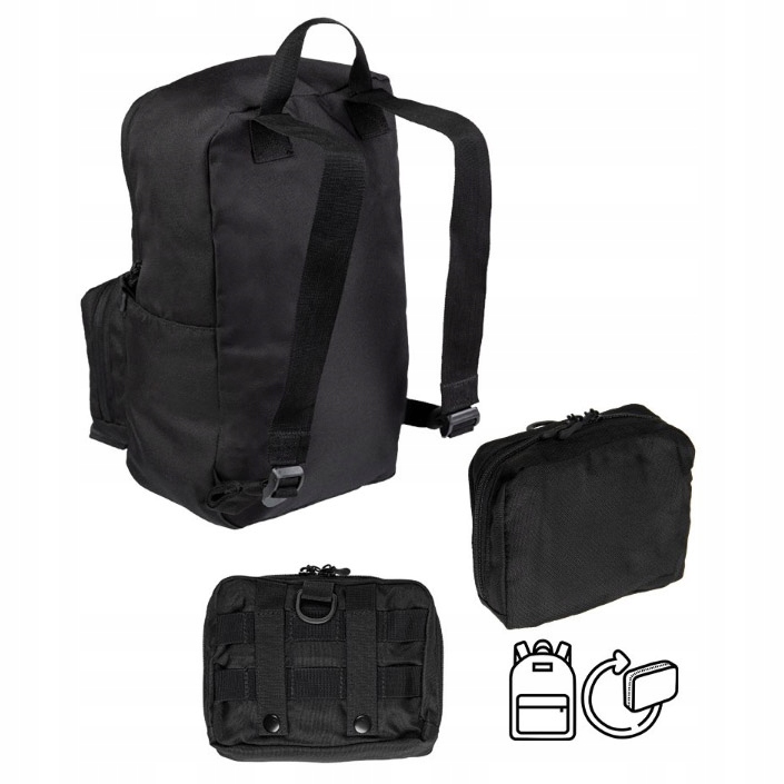 Помимо основного отделения рюкзак оснащен передним карманом меньшего размера. рюкзака, что облегчает переноску ключей и кошелька. Все карманы закрываются на молнию. Ремни системы MOLLE/PALS и панель на липучке пришиты спереди, что позволяет легко прикрепить, например, нашивки боевого духа или дополнительные аксессуары.