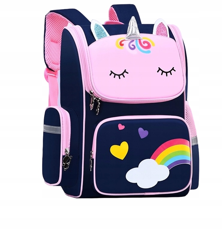 рюкзак имеет красивый темно -синий цвет, красивые ползунки с смайливыми лицами, детали: угол единорога и ушей (подкладка, сетчатый карман, ухо, чтобы повесить рюкзак, например, на крючке в плащной комнате).