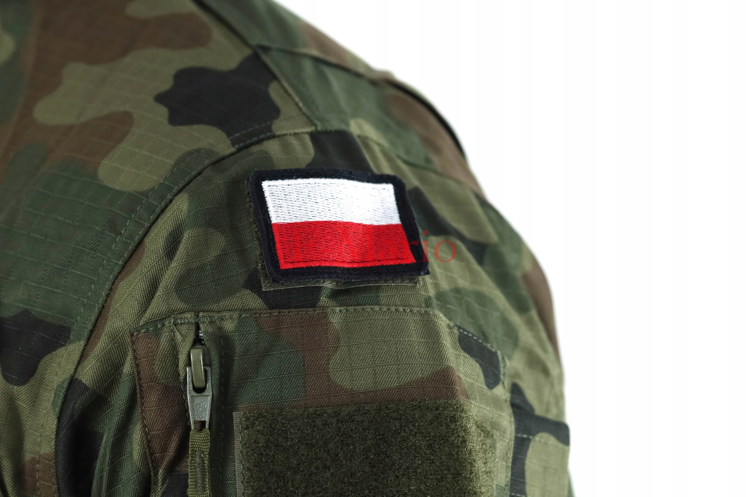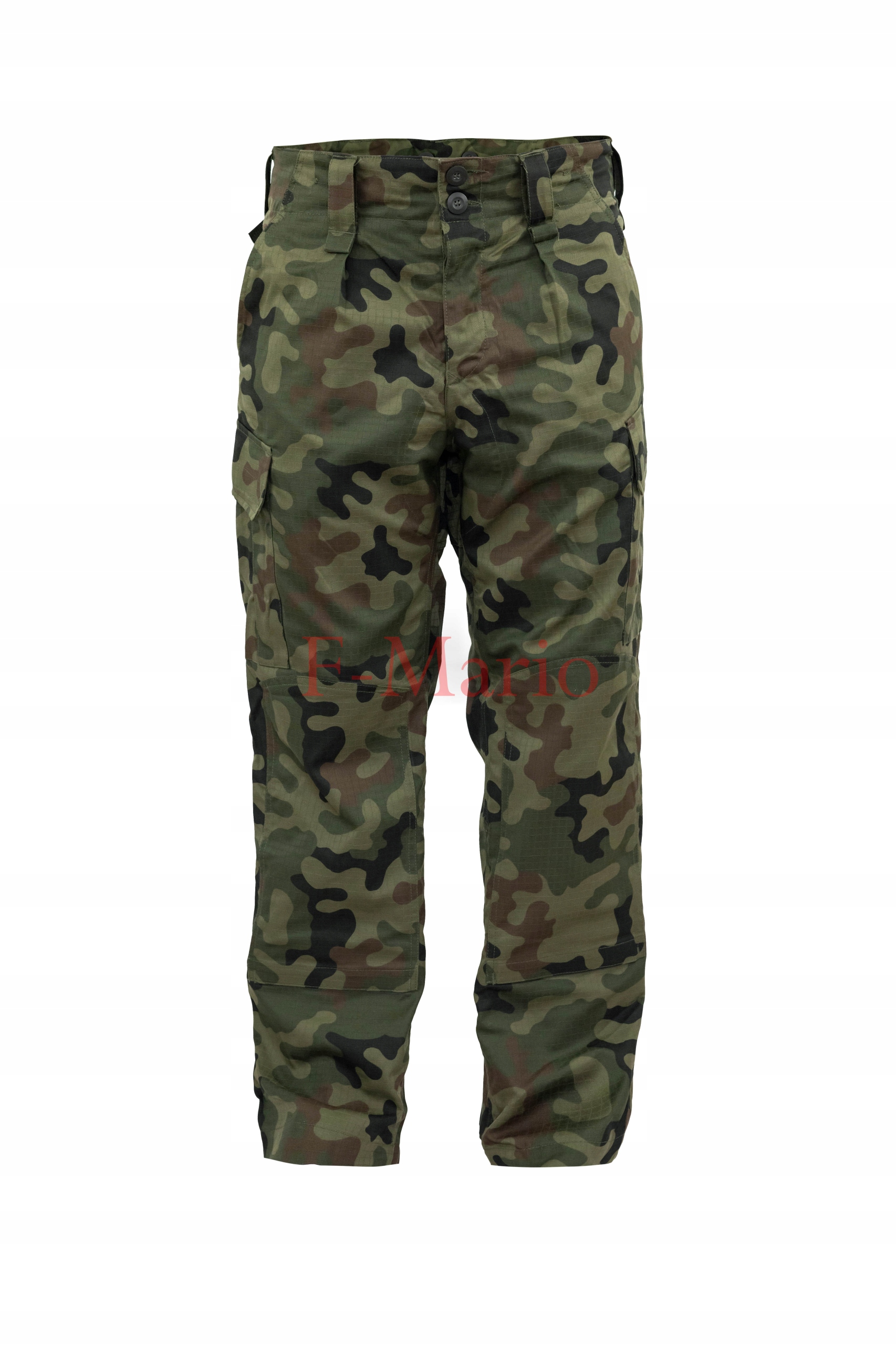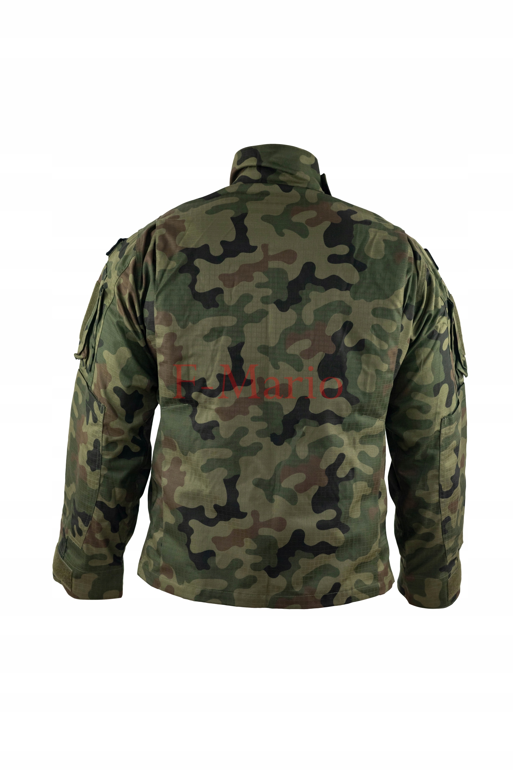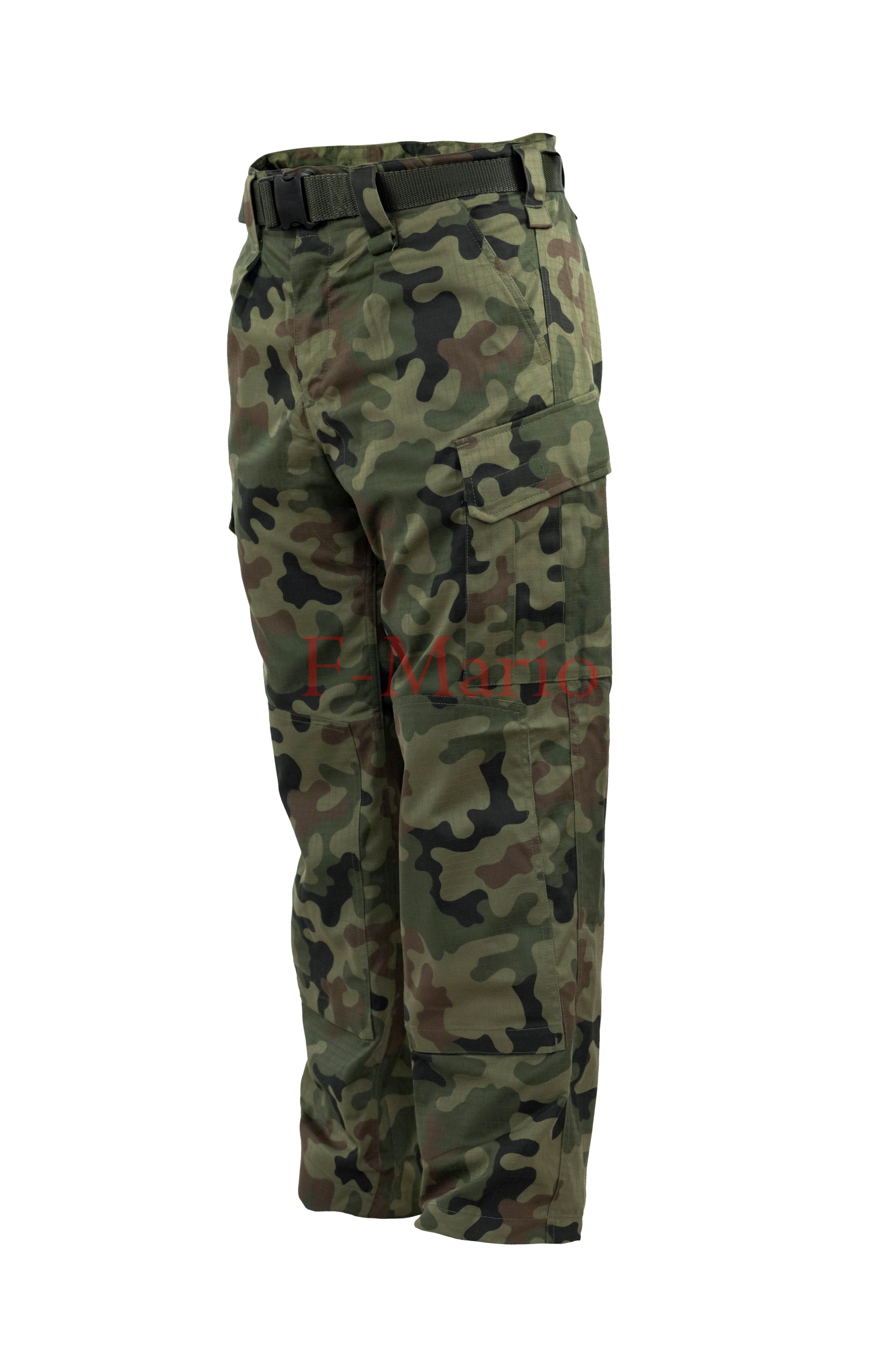 Униформа из хлопка и полиэстера, материал рипстоп, оригинальное производство для Войска Польского. Толстовка имеет воротник-стойку и 5 карманов на липучках, на плечах застежки-липучки для флажков, общее количество застежек-липучек - 5 для маркировки, а также "карманы" на локтях для протекторов. Толстовка имеет вертикальное место для ножен/погона со ступенькой. Брюки имеют 2 стандартных кармана и 2 кармана на бедрах на липучках, «карманы» для протекторов вместо колен, брюки усилены в нефрологических местах двойной строчкой материала, завязки внизу брюк. подтянуть ноги.