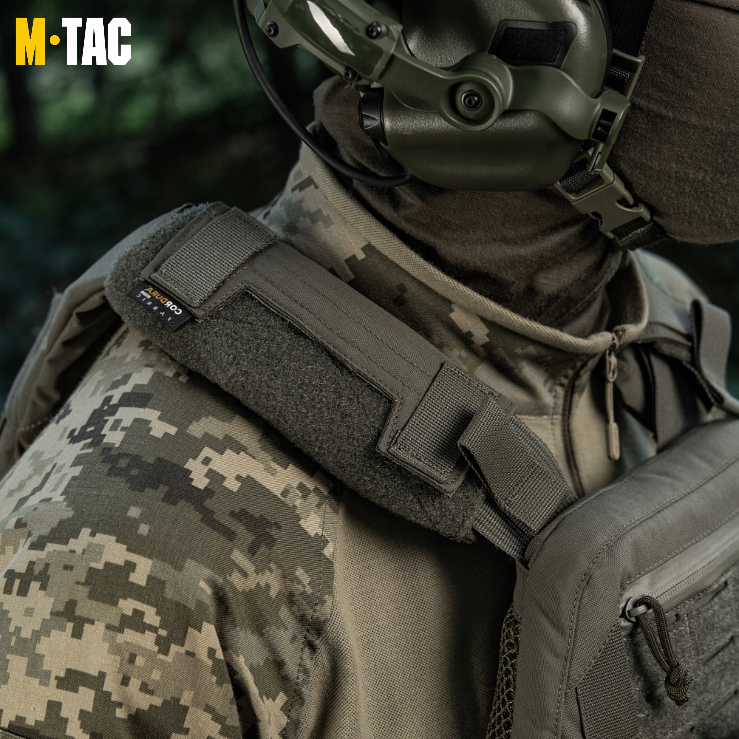 Комфортные накладки состоят из удлиненного кармана на молнии YKK®, внутри находится пена, гарантирующая хорошее качество амортизация, которую при необходимости можно заменить другим материалом. Внизу имеется разделительная сетка 3D MESH, обеспечивающая хорошую вентиляцию. Comfortpad крепится к ремню безопасности с помощью панелей Velcro®. Кроме того, к жилету можно прикрепить специальный наплечник, что повышает комфорт при использовании более тяжелых баллистических пластин.