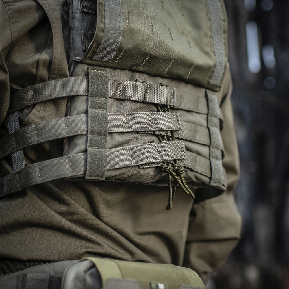 Здесь можно укоротить или удлинить жилет. пояс, продев веревку через петли на лямках. Это простое и долговечное решение, являющееся стандартом для жилетов Plate Carrier.