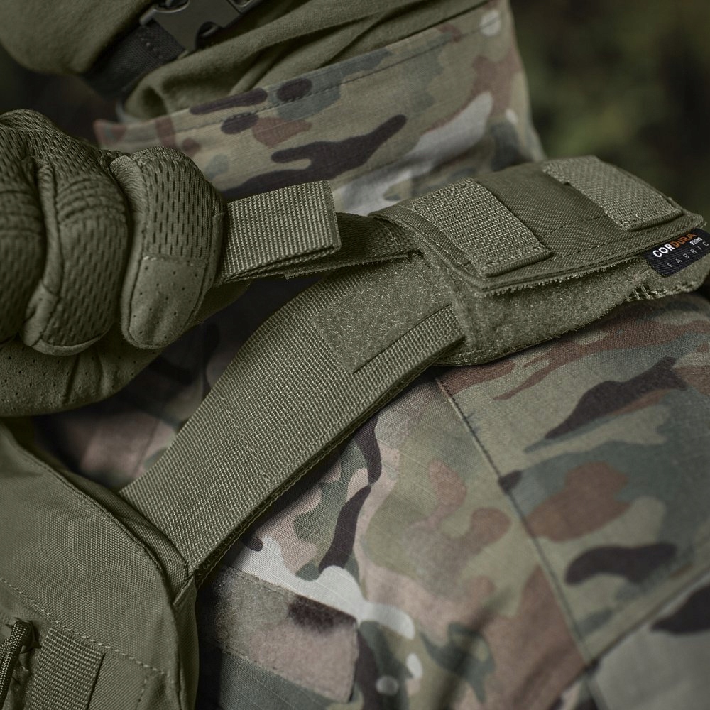 Комфортные накладки представляют собой удлиненный карман, закрывающийся на молнию YKK®, внутри находится пенагарантирующаяхорошую амортизацию, которую можно заменить на другую. материал при необходимости. Внизу имеется разделительная сетка 3D MESH, обеспечивающая хорошую вентиляцию. Comfortpad крепится к ремню безопасности с помощью панелей Velcro®. Кроме того, к жилету можно прикрепить специальный наплечник, что повышает комфорт при использовании более тяжелых баллистических пластин.