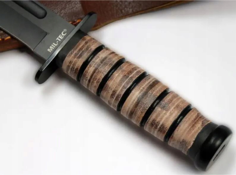 Профилированная противоскользящая рукоять изготовлена из приятных на ощупь, спрессованных дисков из воловьей кожи.Профилирование конструкция и используемый материал позволяют пользоваться ножом в перчатках или холодными руками.