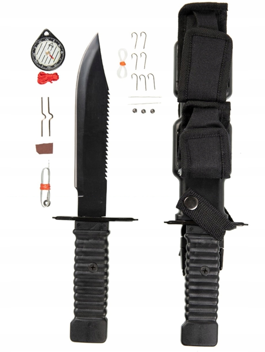 В комплекте Нож поставляется в прочной кобуре (ножнах) с 2-мя карманами для аксессуаров: 1) пила 2) две иглы 3) семь крючков 4) леска 5) три гири 6) Компас на веревке + 7) Нож с ножнами.