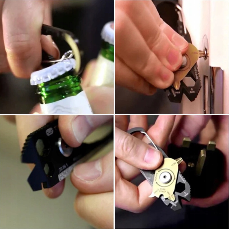 Удобный карабин, который может понадобиться каждый день. Он небольшого размера и поместится в кармане. Мы также можем прикрепить его к нашим ключам, чтобы всегда иметь его с собой. Он имеет 20 различных инструментов, полезных в любой ситуации. Его можно взять с собой в поездку в лес, на кемпинг, в палатку или в горы.