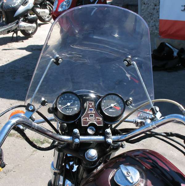 Стекло изготовлено из пластика (оргстекла) толщиной около 1,8 мм. Предназначено для чопперов, классических и туристических мотоциклов. Рекомендуется для езды с макс. скорость около 130 км/ч.