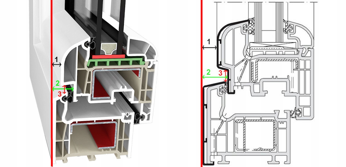 2. окно с полузаподлицо профилем - размер С - отмечено красной линией. Инструкции по измерению выше.