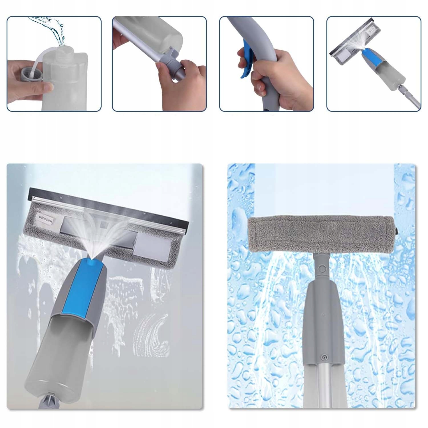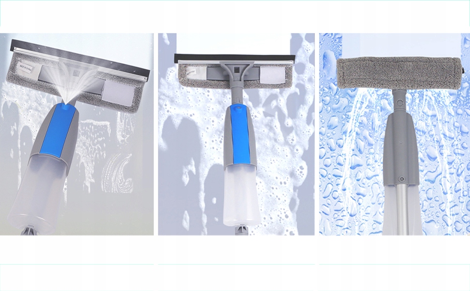 -Руководство по очистке имеет бутылку, в которую вы можете залить воду или моющее средство, а затем нажмите кнопку на ручку, чтобы распылить ее. Любой момент.