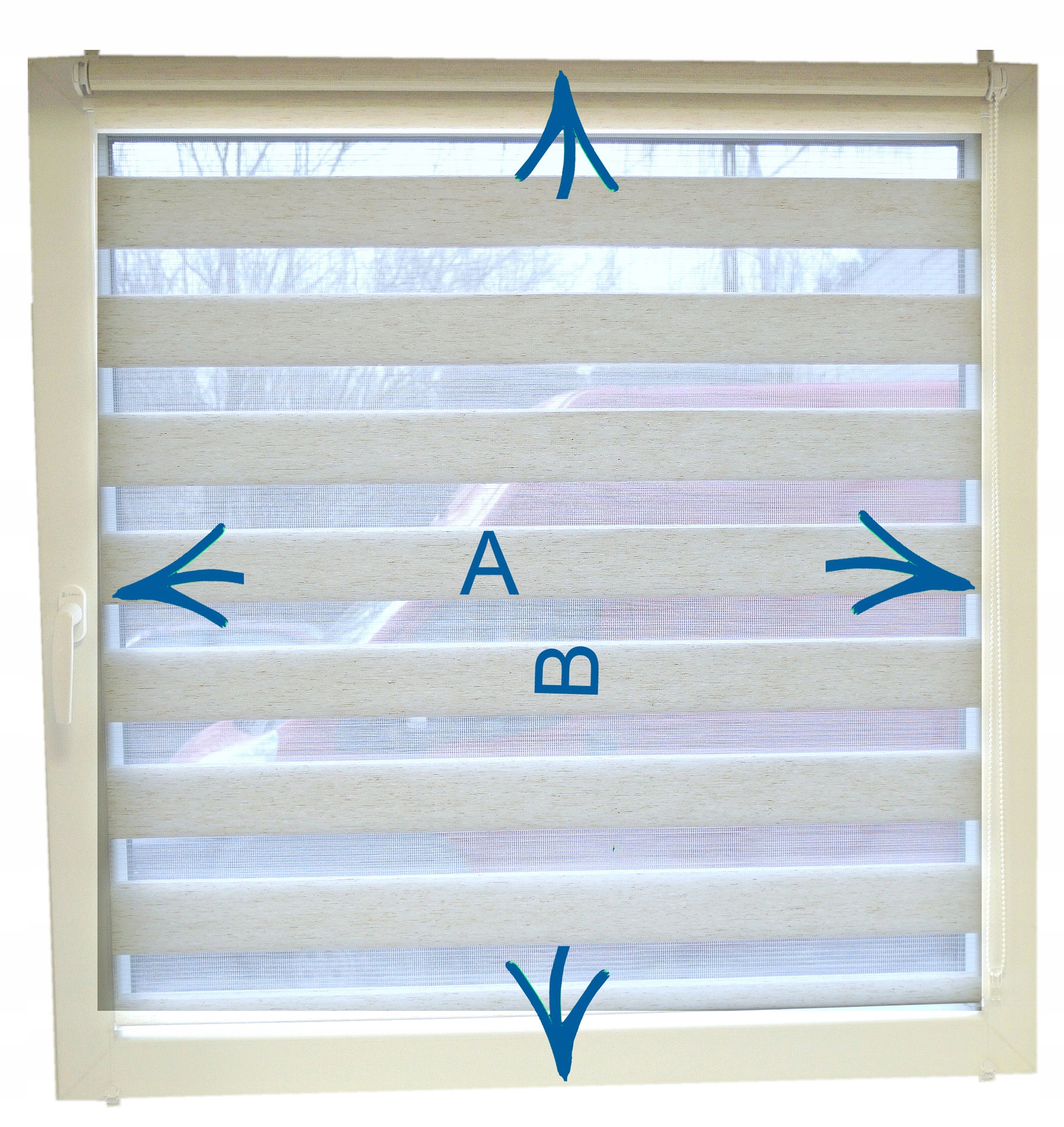- ШИРИНА: измерьте ширину стекла (A). К полученной ширине добавьте от 2 до 8 см. Помните, что рулонная штора должна быть немного шире стекла, но не закрывать ручку. Рекомендуемое минимальное расстояние между тканью и ручкой — 0,5 см.
