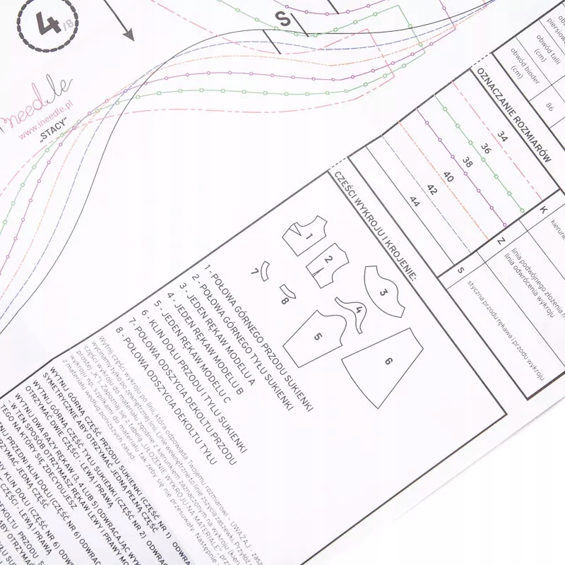 Узор простой и понятный. Он размещается на большой лист бумаги и его размеры четко обозначены. Найти конкретный размер не составит труда, поскольку каждый из них отмечен разным цветом. Благодаря практическим советам, включенным в выкройку, вы узнаете, как правильно измерить свою фигуру и подобрать нужный размер, а также как обвести выкройку и вырезать ткань.