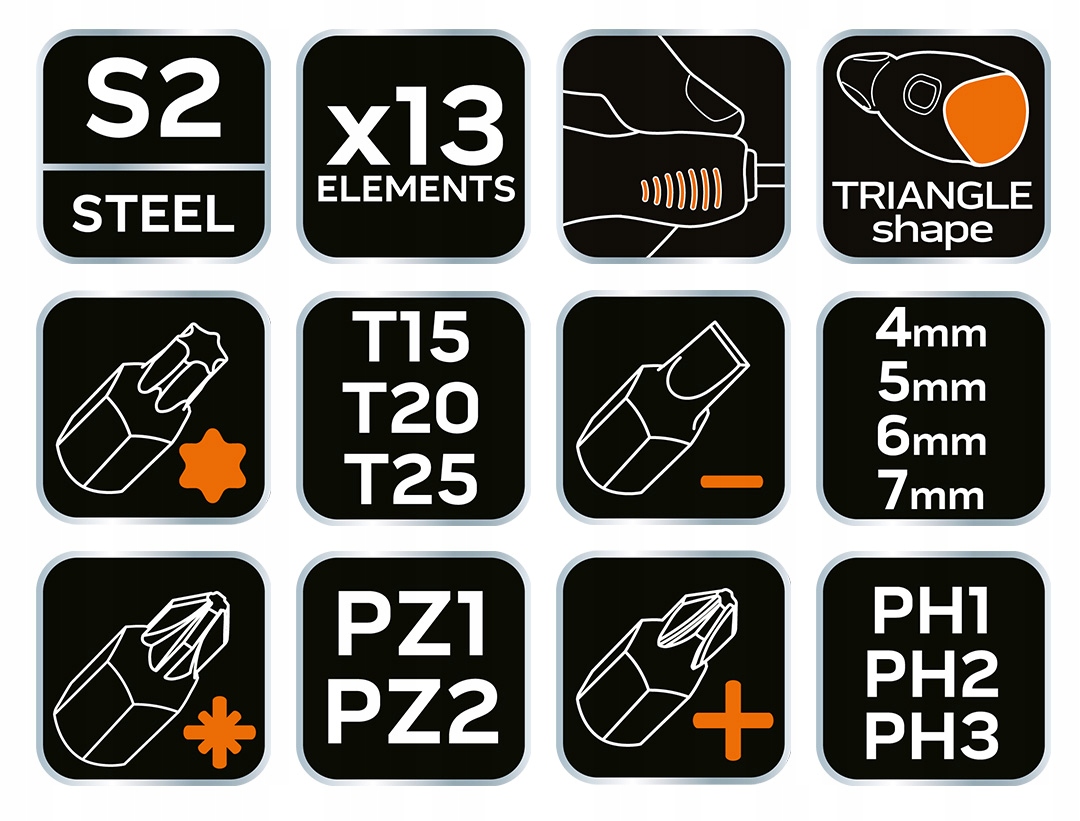 Отвертка с гибким наконечником, набор 13, 04-215 производства NEO — инструмент с мягким наконечником, предназначенный для вкручивания бит под углом и доступа к труднодоступным местам. В наборе 12 бит и держатель. Наконечник из стали S2 отличается высокой прочностью и твердостью HRC 51-54. Входящие в комплект насадки имеют следующие размеры (6,35 x 25 мм): SL 4, 5, 6, 7 мм, PH1, PH2, PH3, PZ1, PZ2, T15, T20, T25. Инструмент имеет треугольную форму рукоятки и профилированную упору для большого пальца, что снижает нагрузку на руку во время работы. Ручка из двойного материала устойчива к химическим веществам, маслам и жирам благодаря покрытию TPR. Отвертка с гибким лезвием марки NEO рекомендуется любителям DIY и отделочникам.