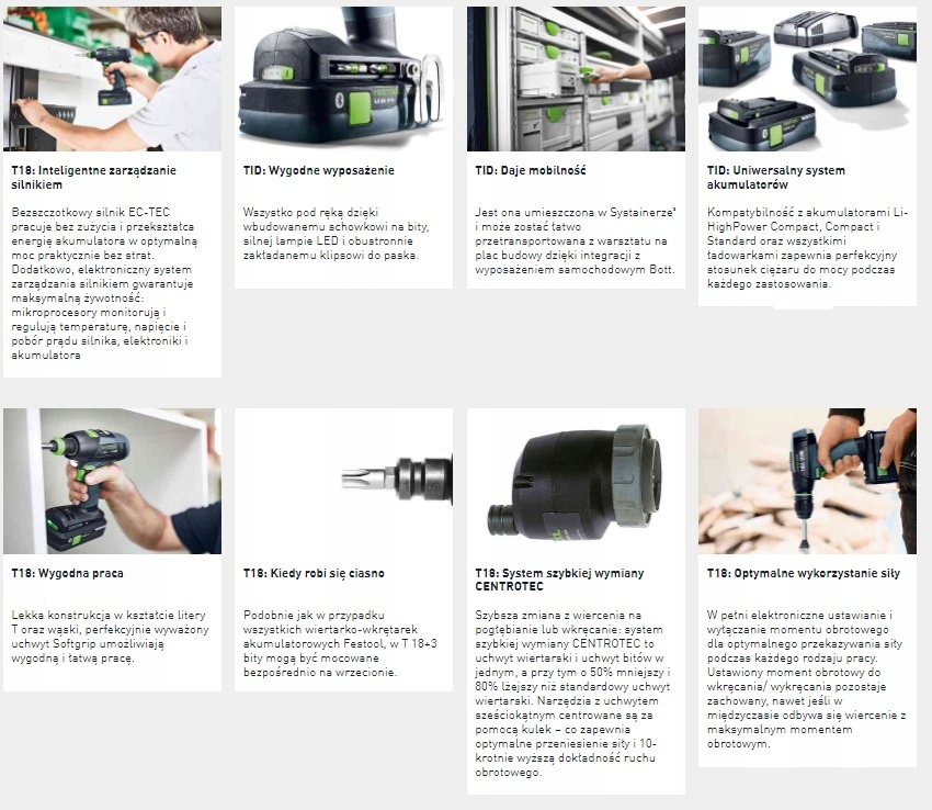 - Мощность и гибкость. В одном систейнере. Аккумуляторная ударная отвертка TID 18 чрезвычайно эффективна и имеет три уровня скорости, что позволяет работать с различными материалами. Умное решение: Т-режим, который определяет переход от листового металла к дереву и автоматически регулирует скорость вращения. Аккумуляторная дрель-шуруповерт T18+3 оснащена системой быстрой смены CENTROTEC, угловой и эксцентриковой насадкой, а также ограничителем глубины, что обеспечивает более быстрое сверление и завинчивание. Благодаря практичной функции запоминания положения переключателя заданный крутящий момент сохраняется даже при переключении со сверления на завинчивание.