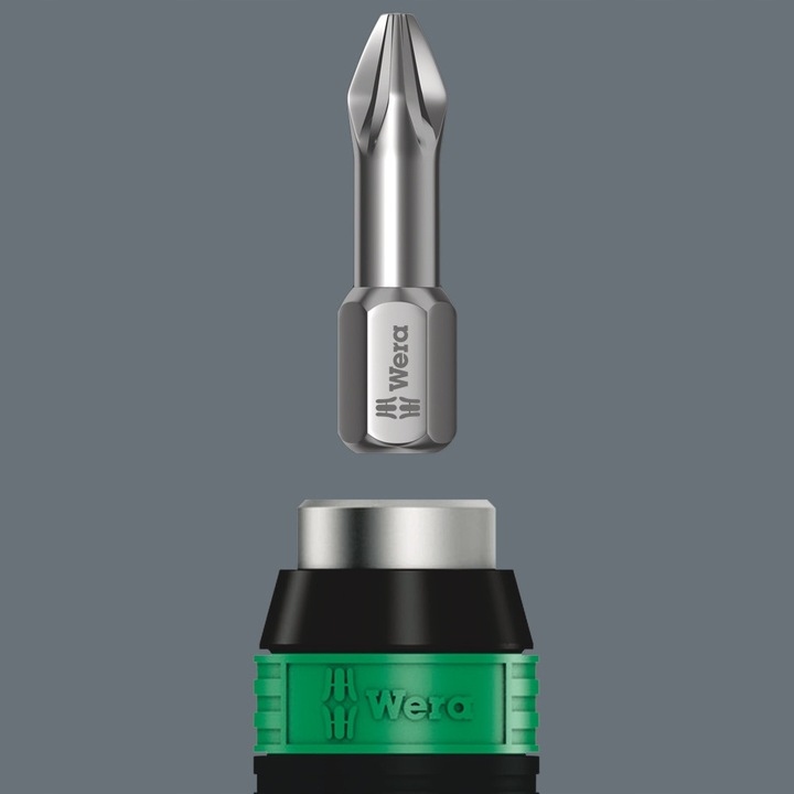 Наконечник можно прикрепить, вставив его в держатель, без необходимости перемещать стопорное кольцо. Как только бита вставлена в паз для винта, она автоматически фиксируется в держателе, обеспечивая надежную фиксацию без риска вибрации.