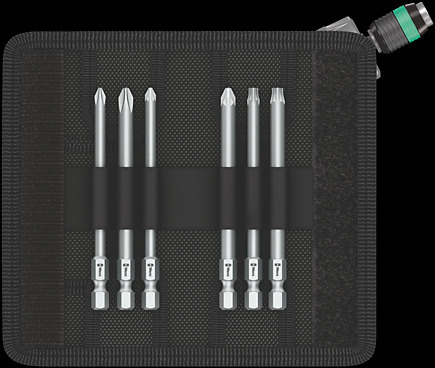 С храповым механизмом: мелкий зуб, небольшой рабочий угол всего 8°, переключатель изменения направления работы (право-лево с фиксатором в среднем положении), передача крутящего момента до 50 Нм; Шестигранный держатель 1/4" с технологией Rapidaptor, магнитный. 6 бит PH, PZ и TORX®, длина 25 мм, для держателей по DIN ISO 1173-D 6.3. С практичным ремнем.