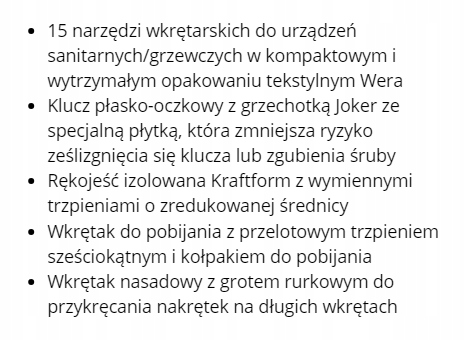 Компактный набор из 15 самых важных отверток для сантехнического и отопительного оборудования. 2 ключа Joker Switch, рукоятка VDE с 4 очень узкими штифтами, тестер напряжения, 4 угловых ключа с пластиковым колпачком, перфорационная отвертка и 2 отвертки Kraftform Plus с трубчатым наконечником. Детали: Два угловых рожковых ключа Трещотка Joker со специальной пластиной для предотвращения соскальзывания или потери винта и увеличения передачи усилия; 1 ручка VDE и 4 штифта VDE iS для безопасная работа под напряжением до 1000 В (штыри iS уменьшенного диаметра и встроенной защитной изоляцией, обеспечивающей доступ к низко расположенным винтовым и пружинным элементам); 1 однополюсный фазометр 247; 4 угловых ключа с профилем Hex-Plus для предотвращения перетягивания винтов; 1 Kraftform 932 Перфорирующая отвертка (для винтов со шлицем) с шестигранным хвостовиком со сквозным отверстием и встроенной перфорирующей насадкой для завинчивания и легких долбежных работ; 2 торцевые отвертки с трубчатым наконечником 395 HO для затягивания или ослабления гаек на длинных винтах, а также для удаления застрявших винтов. Вместе с инструментами предусмотрена система цветового кодирования «Take it easy» в зависимости от размера, что упрощает и ускоряет поиск нужного инструмента.