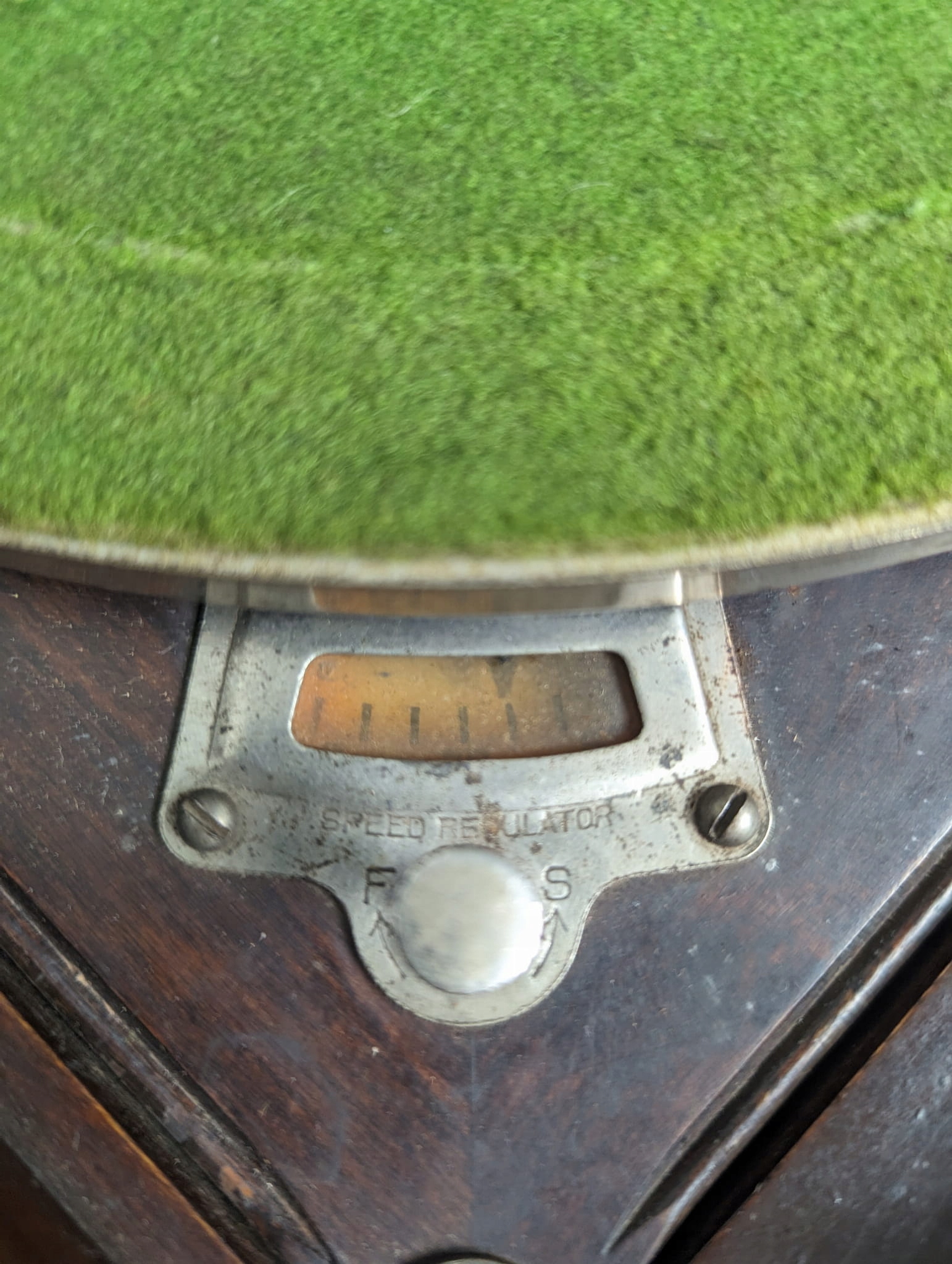 Проигрыватель работает на рукоятке. Имеет механический привод - пружину, заведенную с помощью кривошипа, и не требует подключения к электричеству.
