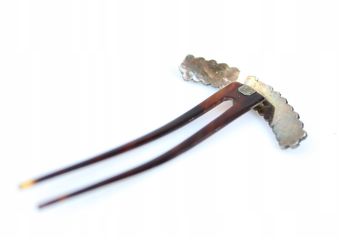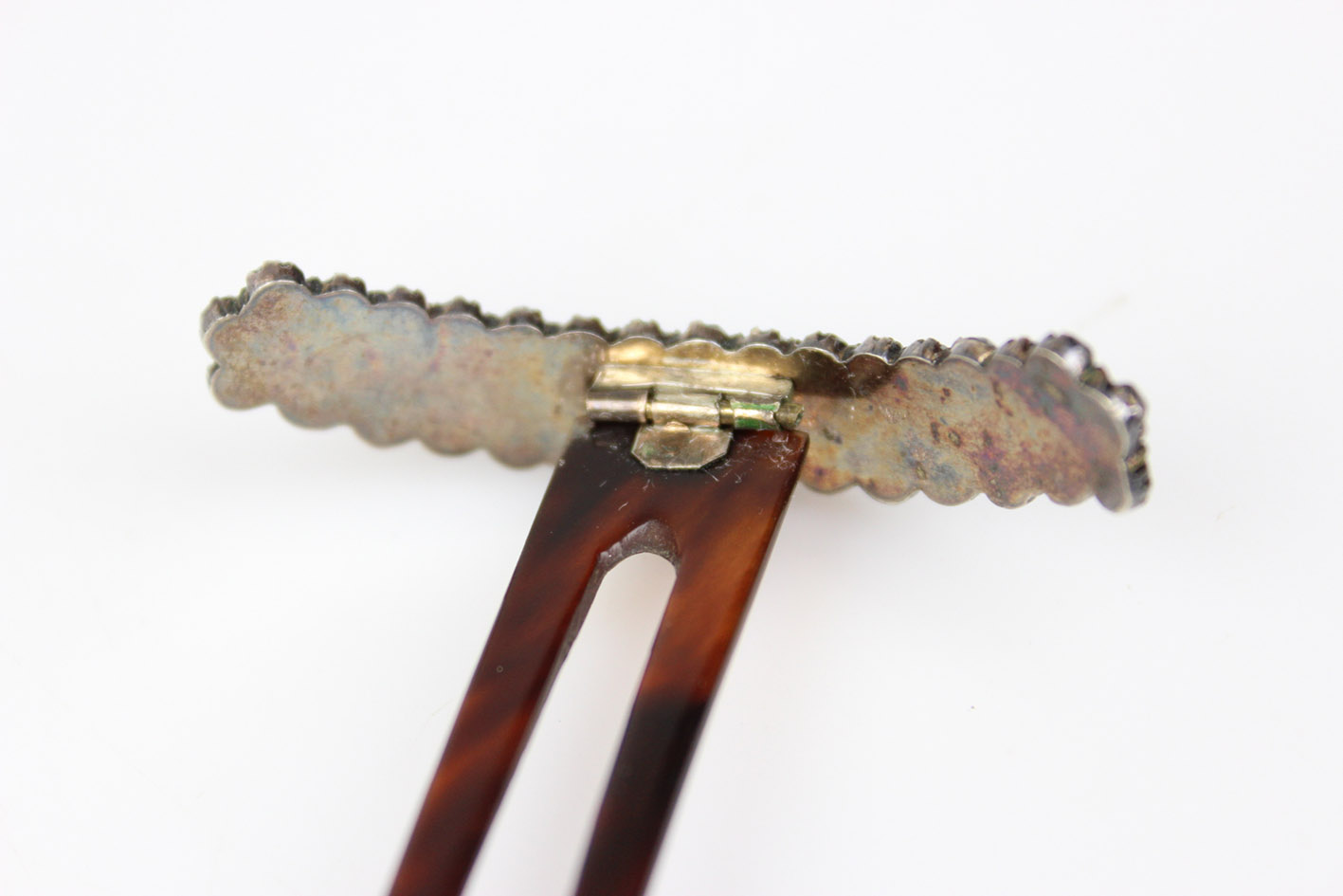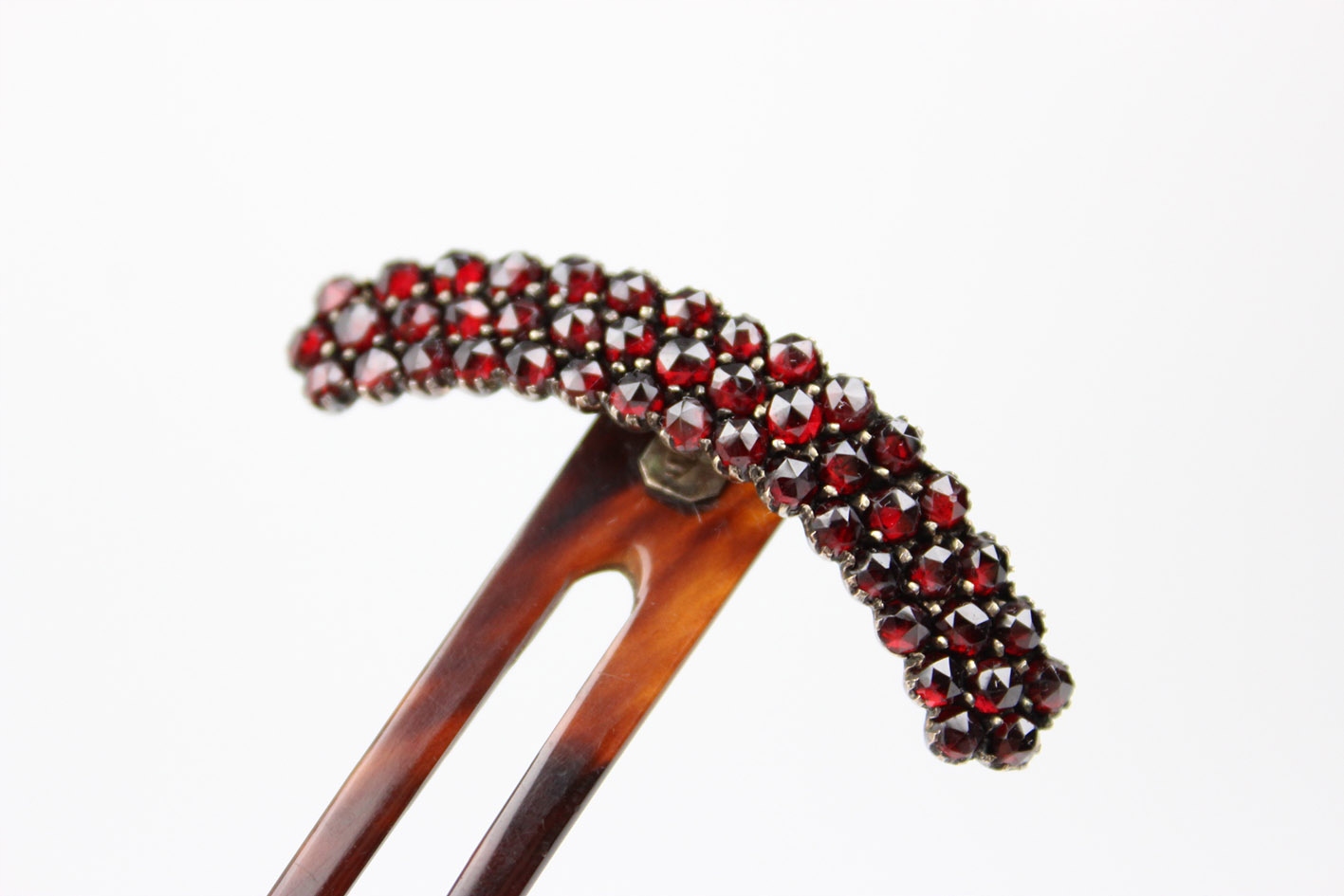 Изящный викторианский гребешок/заколка для волос рубежа XIX и XX веков. Шарнирная конструкция из позолоченной латуни. Арочная галерея обрамлена натуральными гранатами. Размеры: