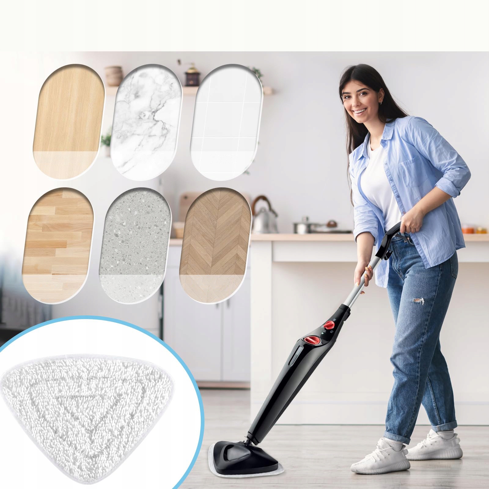 многоразового использования и может быть промыта в стиральной машине при 60 ° С. Треугольная головка была разработана для легкодоступных углов и краев. Паровая швабля для очистки пола: очищает и дезинфицирует пол, обеспечивая его более глубокой очисткой.