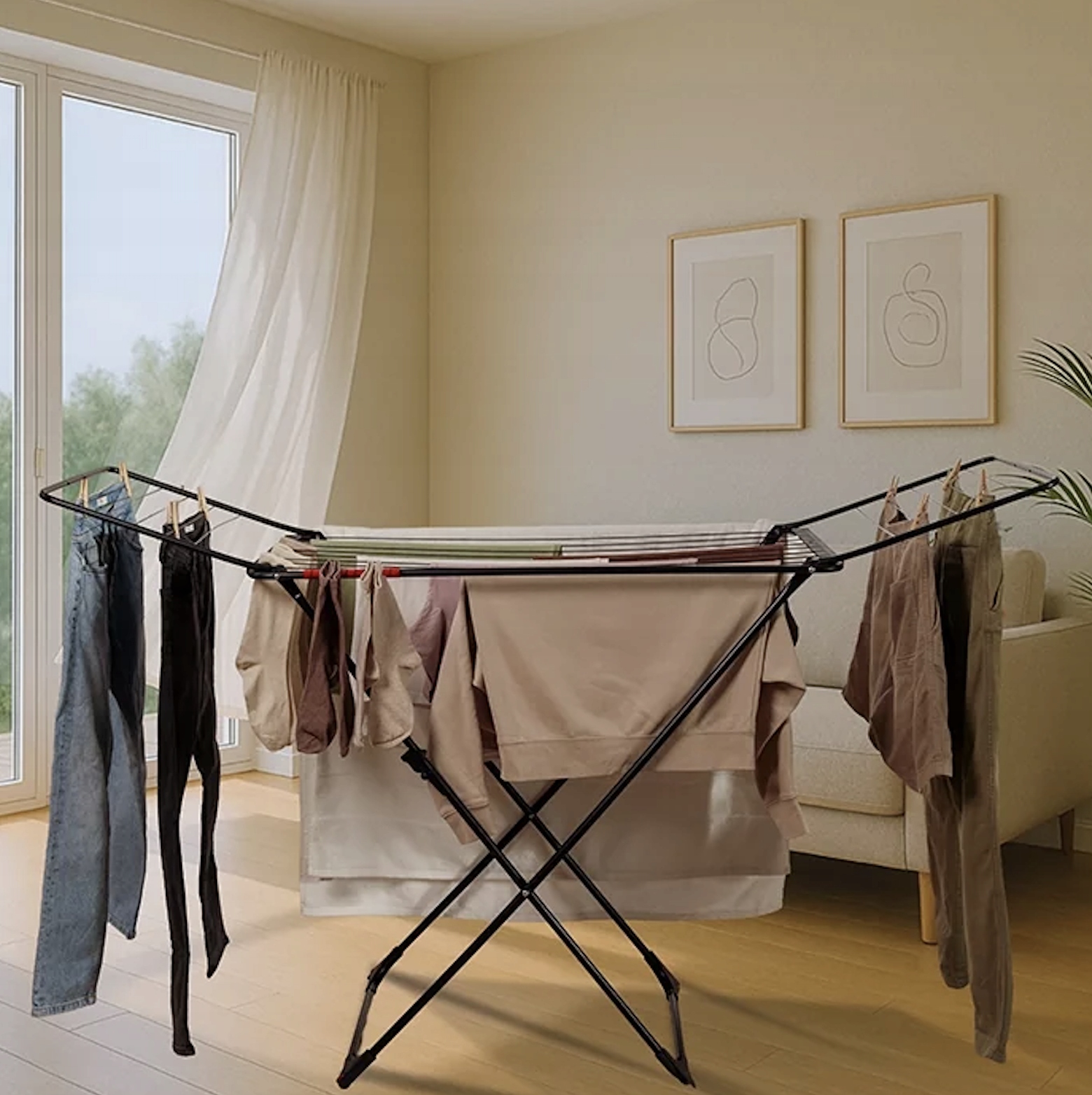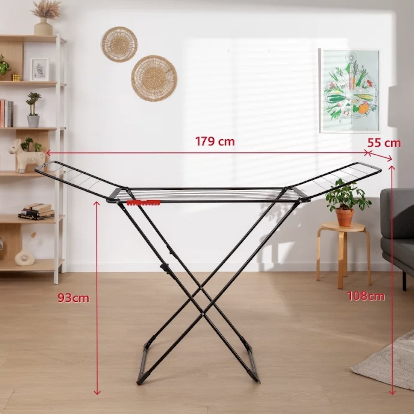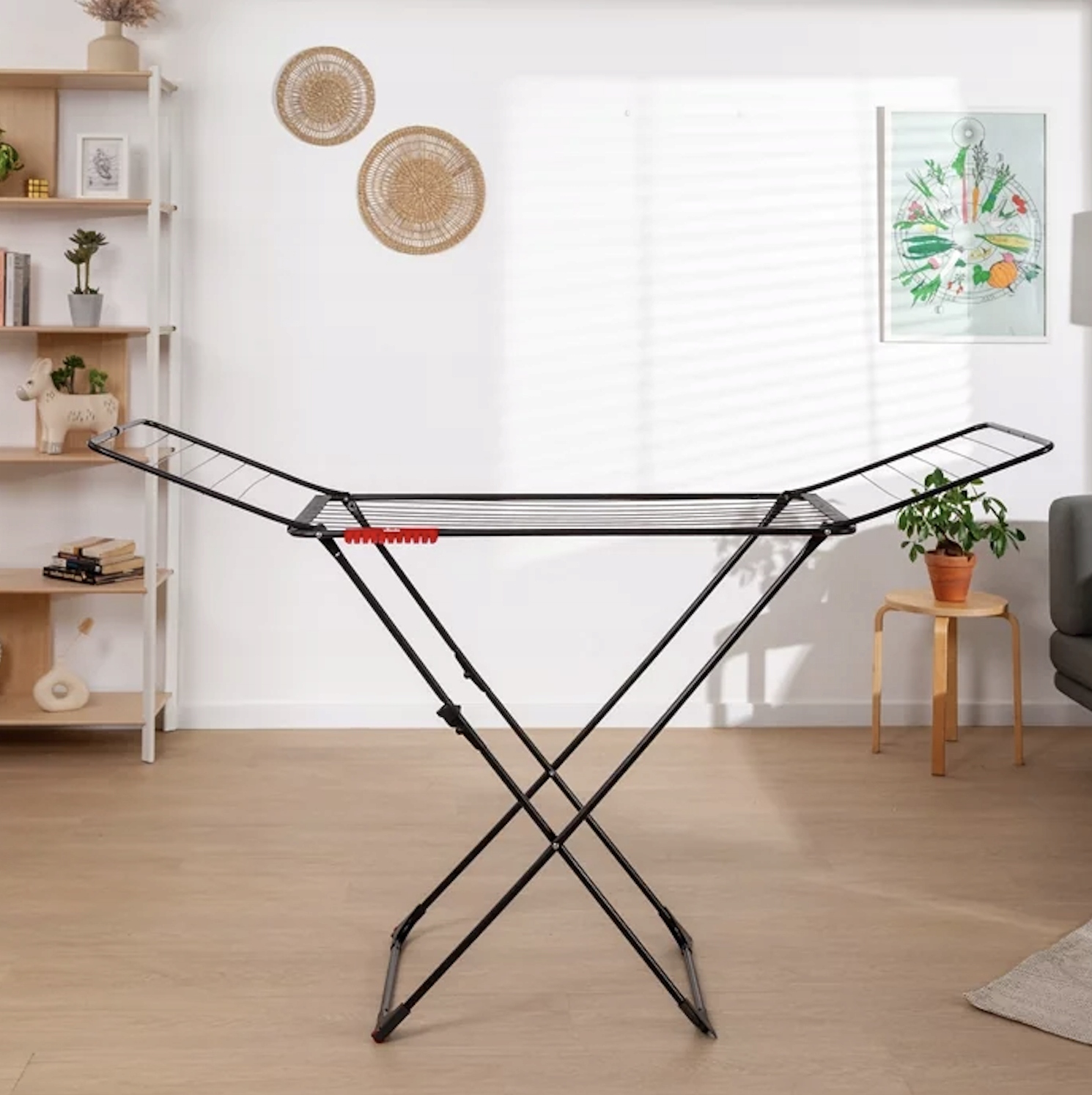 Складные Х-образные ножки значительно упрощают раскладывание сушильной машины. Оснащен фиксатором крыла и фиксатором для предотвращения раскладывания. Прочная стальная рама обеспечивает долговечность и устойчивость.