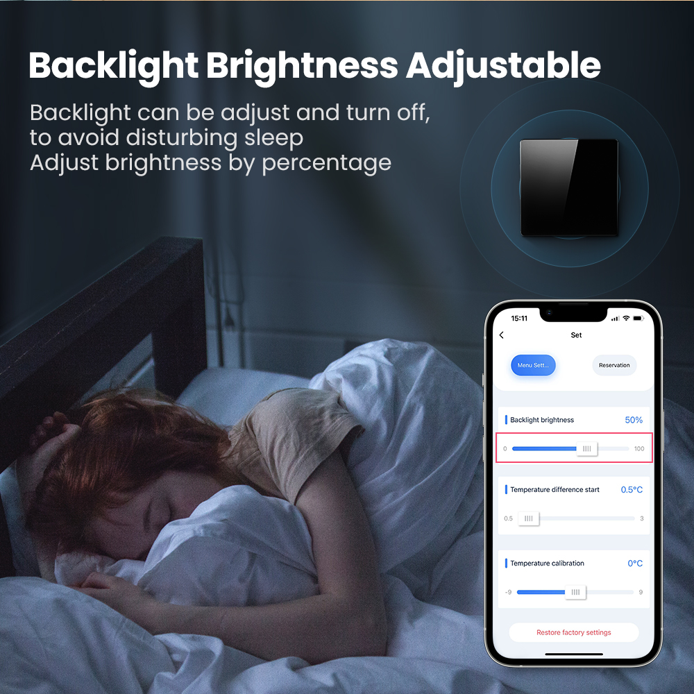 Яркости подсветки】 -подсветку можно отрегулировать и выключить, чтобы избежать нарушения сна. Отрегулируйте яркость на процент 【Калибровка температуры】 -дисплей, разница в температуре Нарежьте калибровку температуры (от -9,9 ° ℃ до 9,9 ℃)【Выбор датчика】-Винтернальную проверку/внешний датчик оба датчика/минимальный ограничение температуры: 5 ° ℃ Максимальная температура. В группе.