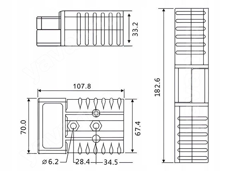 Это сильноточный разъем на 350А в корпусе из поликарбоната, большой и прочный. Внутренние контакты изготовлены из большого количества меди, покрытой слоем серебра. Они обеспечивают экономичное, прочное и безопасное соединение.